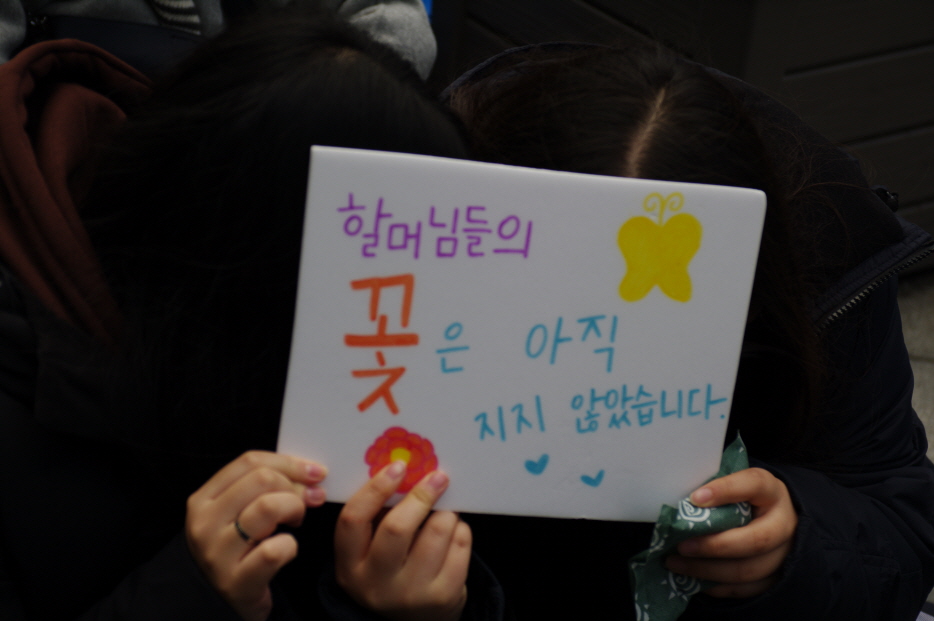 이어 보건의료노조 서울본부 노조원들의 신나는 율동공연 후 참가단체 소개와 자유발언이 이어졌습니다. 양정여자중학교 문가연, 김수련, 나포중학교 채정, 전은미, 다부초등학교 이건희, 민범기, 연희중학교 황인혁, 정로회신학대학교 김소혜, 나가노 마사토, 마리몬트 김건영 님의 자유발언이 있었습니다. 나포중학교에서는 기부금 전달을 해주었고, 연희중학교에서는 할머니께 쓴 편지를 소개해 주었습니다. 다부초등학교 학생들은 <아리랑>에 맞추어 할머니께 전하는 카드섹션을 보여주었습니다. 마리몬드 김건영 님은 마리몬드에서 진행하고 있는 ‘일제 강제동원 피해자를 청산하고 일본정부의 책임을 면해주는 문희상안’ 반대 캠페인을 소개하고 백지화하기 위한 청원 참여를 독려했습니다.