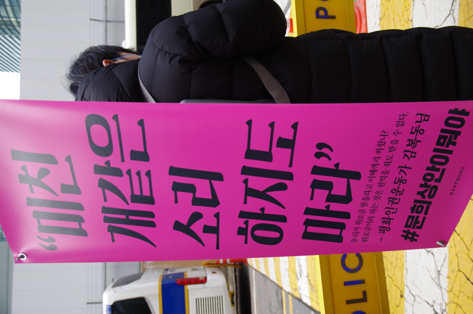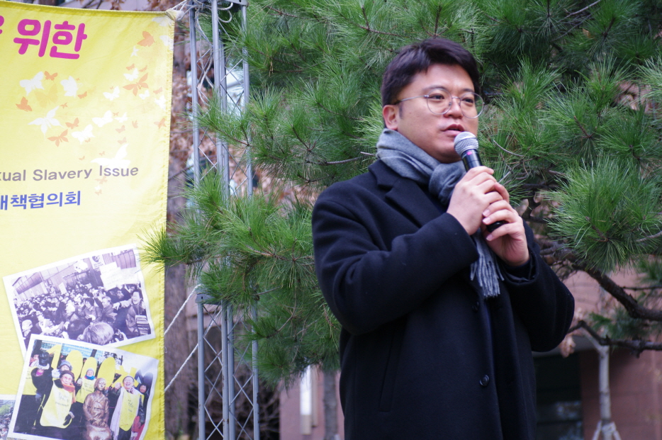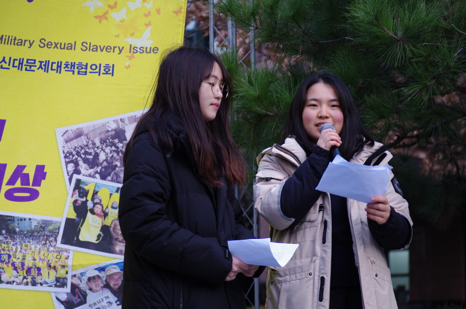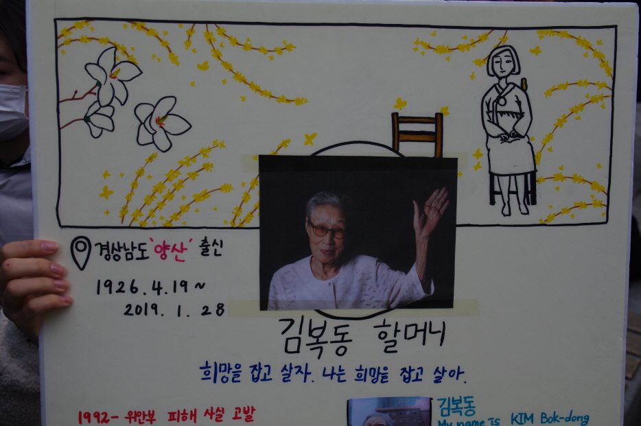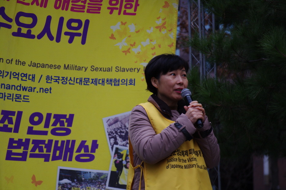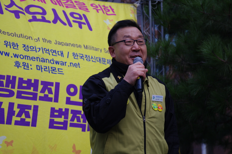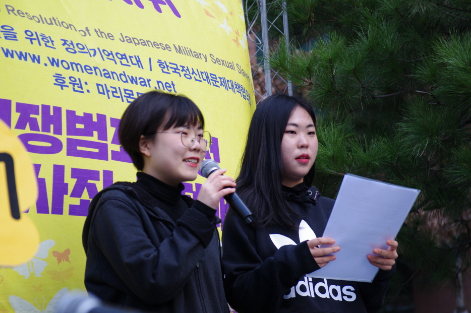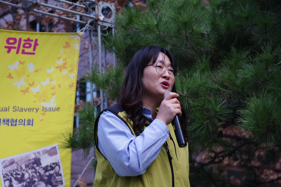 보건의료노조 박노봉 부위원장의 인사말에 이어 한경희 사무총장의 경과보고가 있었습니다. “우리는 이 자리에서 공식 사죄, 법적 배상을 외친다. 공식 사죄, 법적 배상은 28년 동안 할머니와 우리 들이 아주 오랫동안 외쳐온 것이다. 지금 할머니는 이 자리에 안 계시지만 많은 여러분들과 외치고 있다. 피해자의 인권과 명예를 회복하는 길이고, 정의과 평화를 만들어 나가는 길이기 때문이다. 다시는 이런 일이 반복되지 않으려면 우리가 기억하고 잘못한 사람들은 잘못을 인정하고 진정으로 사죄하고 거기에 따를 배상을 하고, 이런 전례, 선례를 만들어야 다시는 이런 일이 반복되지 않는다. 독일은 홀로코스트를 사과하고 또 사과하고 또 사과한다. 기념관이 세계 곳곳에 세워져 있다. 2015한일합의 때 일본 정부는 화해치유재단 만들고 위로금 전달하면서 불가역적으로 문제를 해결하고, 이면으로 소녀상 철거를 이야기하고 다시는 국제사회에 일본군성노예제 문제를 이야기하지 말라고 했다. 그것은 사과하는 사람의 태도가 아니다, 진정으로 사죄하고 잘못을 인정한다면 지속적으로 기억하고 교육하기 위한 소녀상 그 이상의 조형물들을 세우고, 교육하고 기록해 나가야 한다. 지금 세계 곳곳에서 할머니들과 우리의 외침에 이어져 나가고 나비처럼 뻗어나가서 지난달에는 호주 멜버른에서 소녀상이 세워졌다. 그리고 오늘 미국 휴스턴에서 교민들의 힘으로 평화의 소녀상이 세워진다. 그곳 교민들을 중심으로 그곳에서도 아시아의 잔혹한 성범죄 피해자들의 역사를 알리고 교육하기 위해 세워지는 박물관에 소녀상을 옮겨놓을 것이다. 아주 오랫동안 아픔에 말씀하시지 못했고 90년도에 그 아픔이 김학순 할머니의 말씀을 통해 전해지면서 30년 동안 명예와 인권을 회복하고자 이 자리에서 끊임없이 외쳤다. 그 외침은 세계 곳곳에 날아가 정의를 세우고 평화로운 세상을 위해 날아가고 있다. 이 자리에 계신 여러분도 끝가지 함께해 주세기 바란다.”
