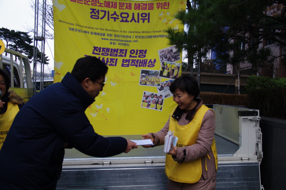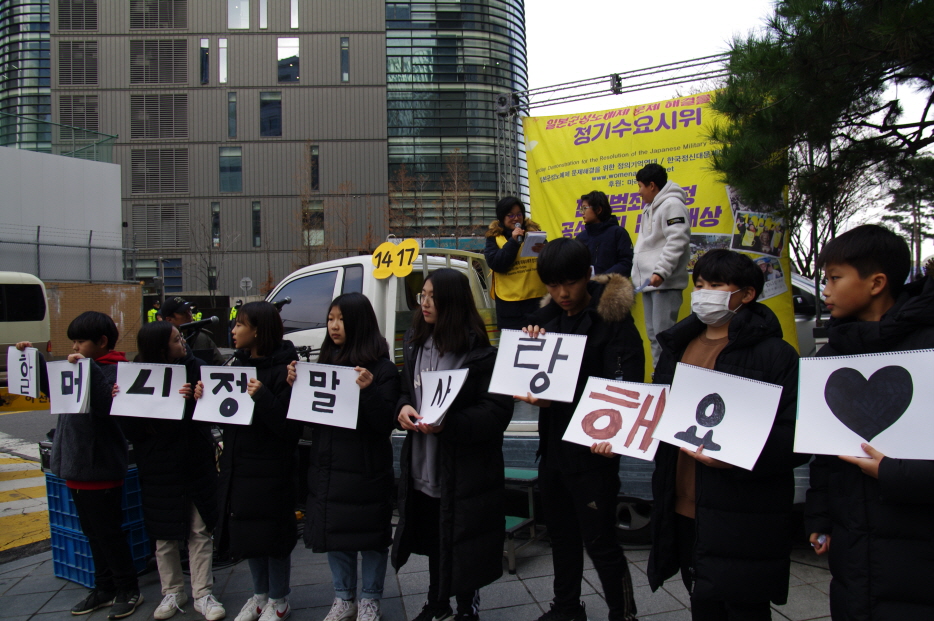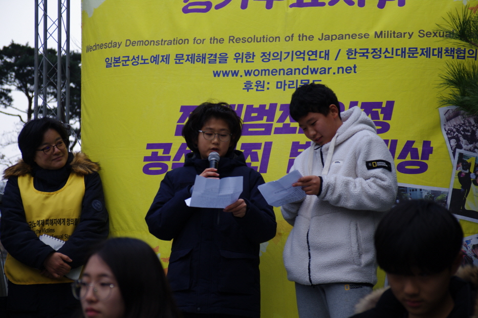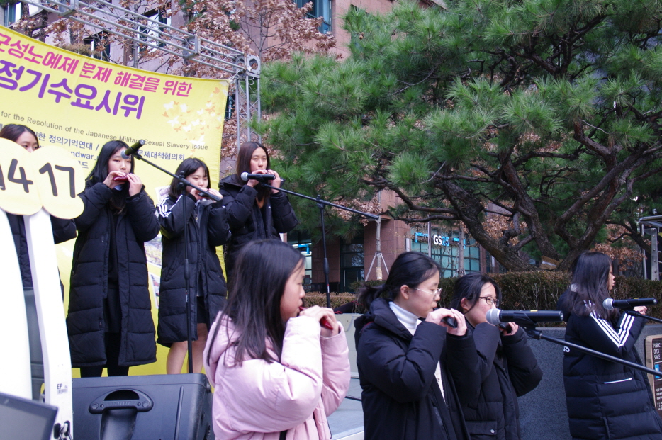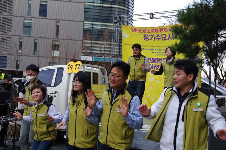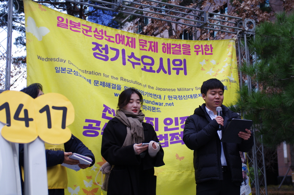 일본군성노예제 문제해결을 위한 1417차 수요시위는 전국보건의료산업노동조합의 주관으로 진행되었습니다. 미세먼지가 많은 쌀쌀한 날씨에도 많은 분들이 함께하였습니다. 이천 양정여자중학교, 양산 범어고등학교, 군산 나포중학교, 마산 청소년지원시설 로뎀의 집, 경북 다부초등학교, 연희중학교, 수원여자고등학교, 예수수도회, 마리몬드, 유성효 민주운동가, 성가소비녀회, 장로회신학대학교, 인제 기린고등학교, 국민대학교 평화의소녀상건립위원회 세움, 그리고 주관단체인 전국보건의료산업노동조합의 전국 지부 등 500여 명이 참가하였습니다.