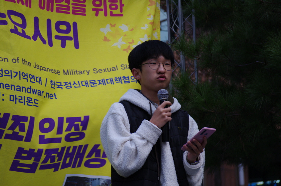 안녕하세요, 저는 정의를 기억하고, 역사를 성찰하고, 미래로 나아가기 위해 이 자리에 선 연희중학교 3학년 황인혁입니다.