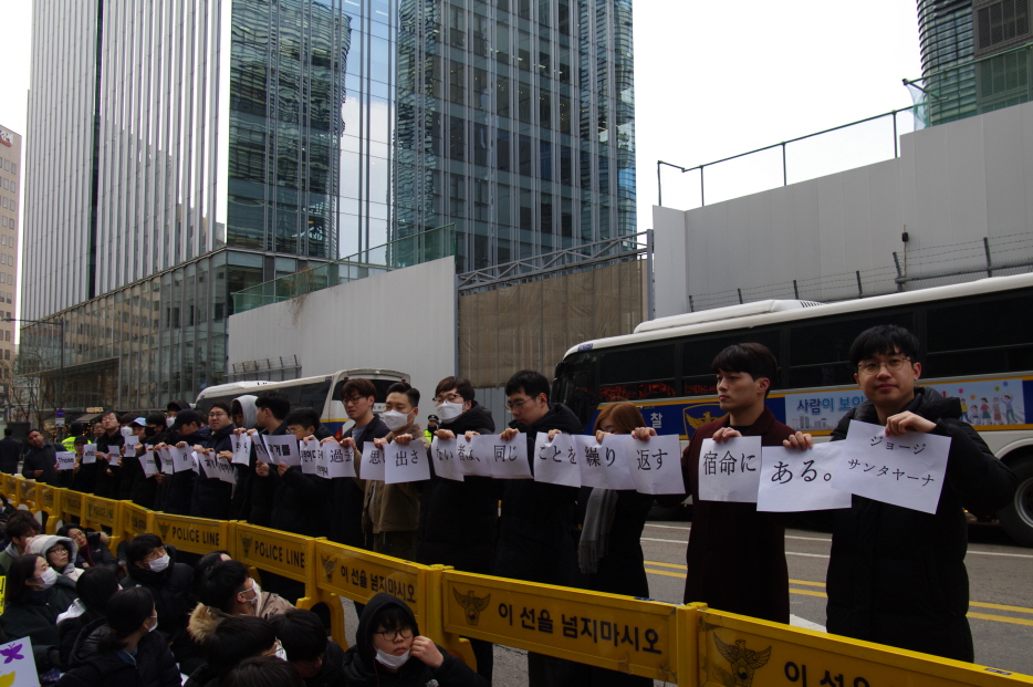 저는 매주 주말, 272번 버스를 탑니다. 경복궁역 즈음에 다다랐을 때 보이는 풍경이 있습니다. 깃발이 휘날리고, 전광판이 빛나며, 스피커가 진동하는 현장입니다. 그곳에 투영되는 미래는 때에 따라 다르지만 크게 두 가지 모습입니다. 하나는 우리의 역사에 당당해지는 미래, 하나는 우리 자신에게 비굴한 미래입니다. 일부 사람들이 왜 자기 자신을 직접 비굴하게 만드는 것인지는 이해할 수 없지만, 한 가지 확실한 것은 이곳에 투영되는 미래는 우리의 역사에 당당하다는 것입니다.