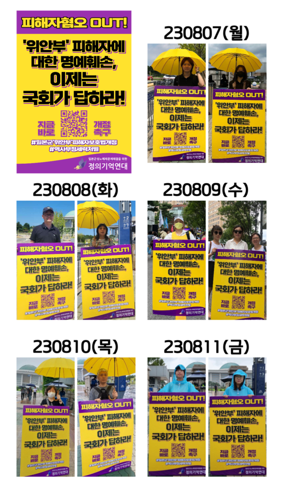 정의기억연대는 6월 14일 1600차 수요시위에서 일본군‘위안부’피해자 보호법 개정 촉구 캠페인 “일본군성노예제 피해자에 대한 혐오를 멈춰라!”를 선포하여, 오늘까지 국회 앞에서 <일본군‘위안부’피해자 보호법 개정 촉구를 위한 릴레이 1인시위>를 진행하였습니다.