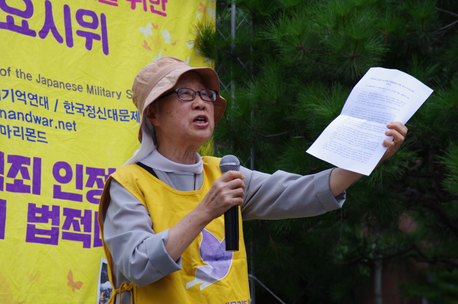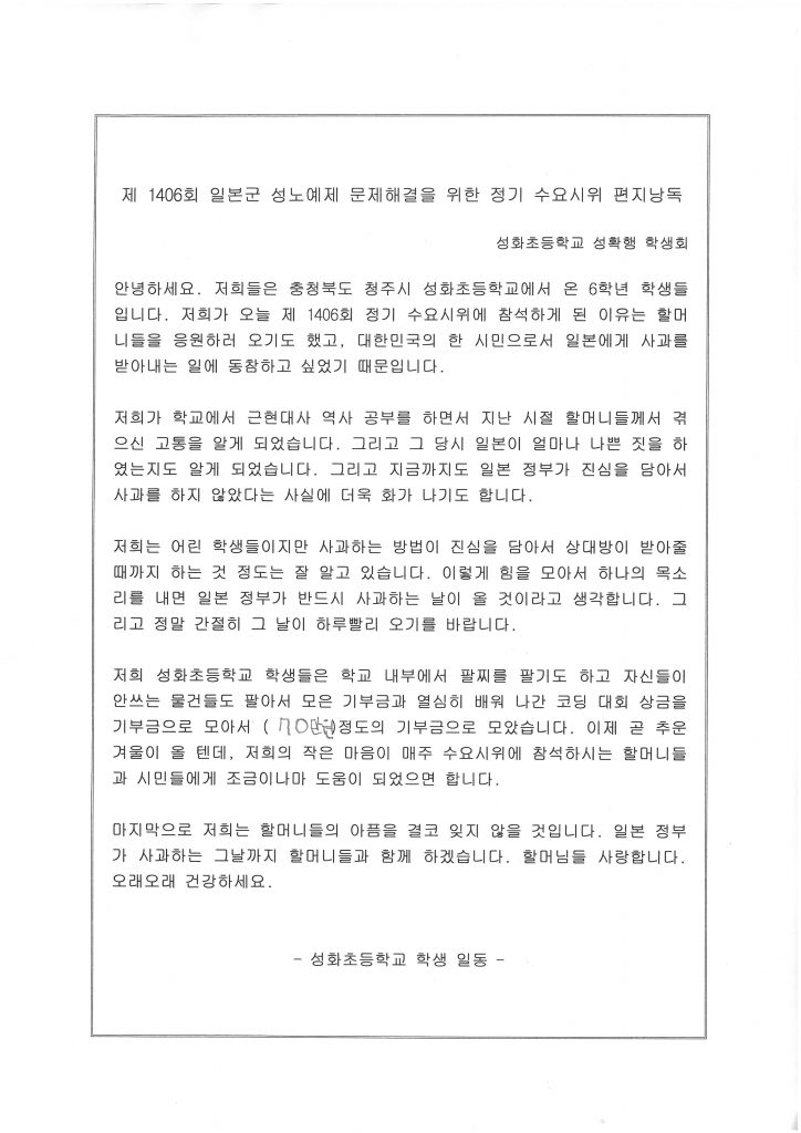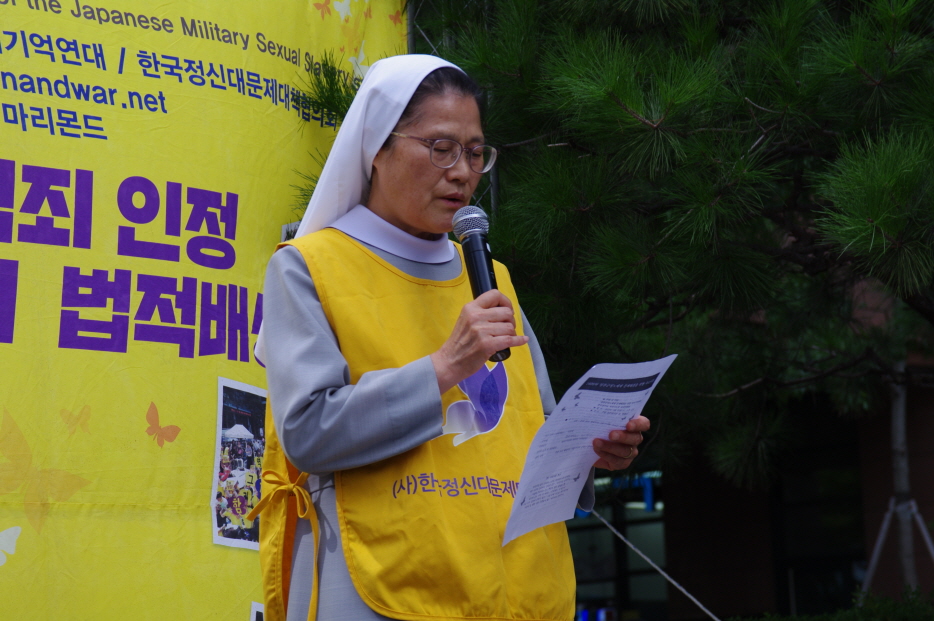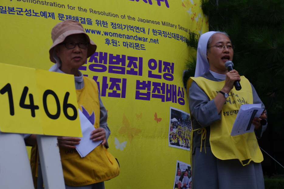 일본군성노예제 문제해결을 위한 1406차 수요시위는 한국천주교여자수도회 장상연합회 주관으로 진행되었습니다. 오늘도 평화로에 청주 성화초등학교, 일본 이바라기대학, 마리몬드, 성균관대학교 학생, 원주 단구초등학교, 민주운동가 유성효, 양산 증산초등학교, 서울 상천초등학교, 청주 덕벌초등학교, 동아시아화해평화네트워크, 툿찡 포교 베네딕토 서울수녀회, 프라도수녀회, 한국외방선교수녀회, 영원한도움의성모수녀회 등 500여 명이 참석하였습니다.