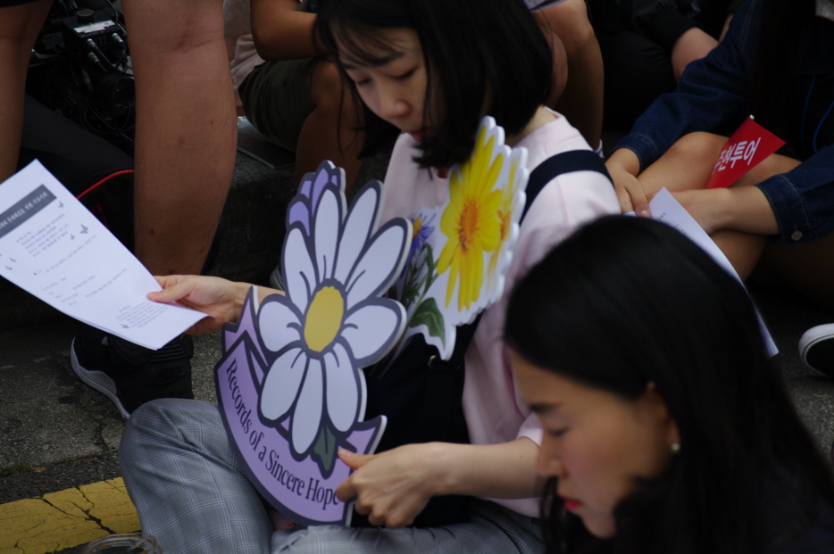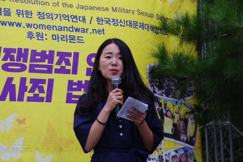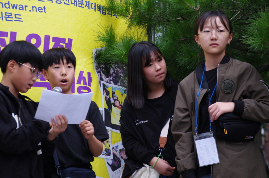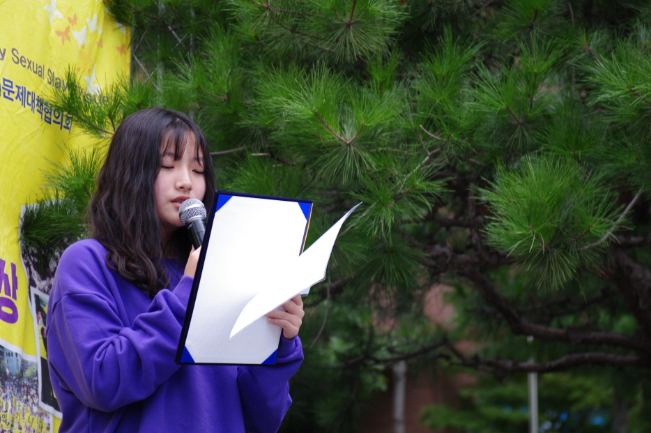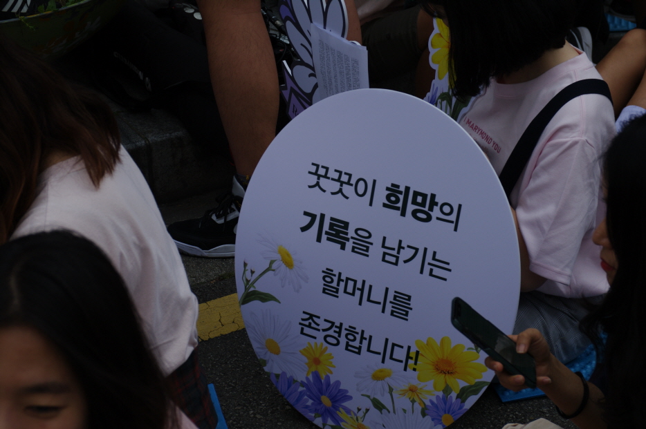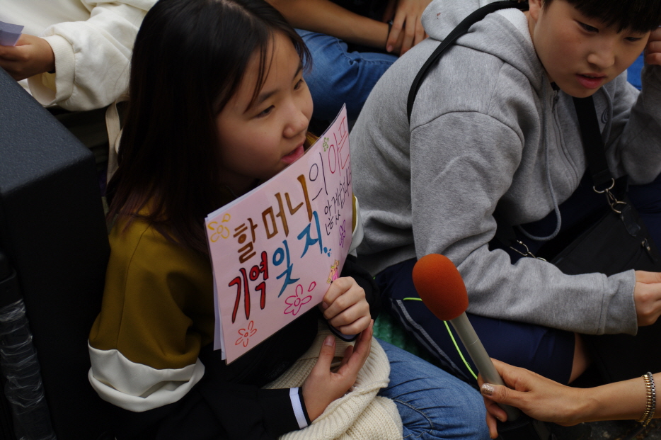 할머니, 저희를 이곳에 초대해주셔서 감사합니다. 여러분 수요집회에 아직 와보지 못한 친구들이 이있 다면 이 자리에 초대해주세요. 이 자리에 오셔서 함께 끝까지 싸워주세요. 오늘 저와 여러분이 함께 해주신 이자리는 정의와 평화를 꿈꾸고, 지키는 자리입니다. 저희 마리몬드도 끝까지 함께 하겠습니다. 감사합니다.