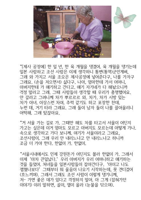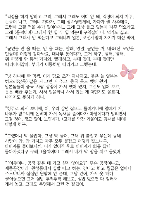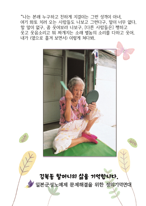 할머니! 미래의 아이들과 여성들을 위해, 용기내주셔서 감사합니다. 당신의 아픔을 넘어서 콩고의 전시 성폭력 여성들을 위해, 나비가 되어주신 할머니 존경합니다.