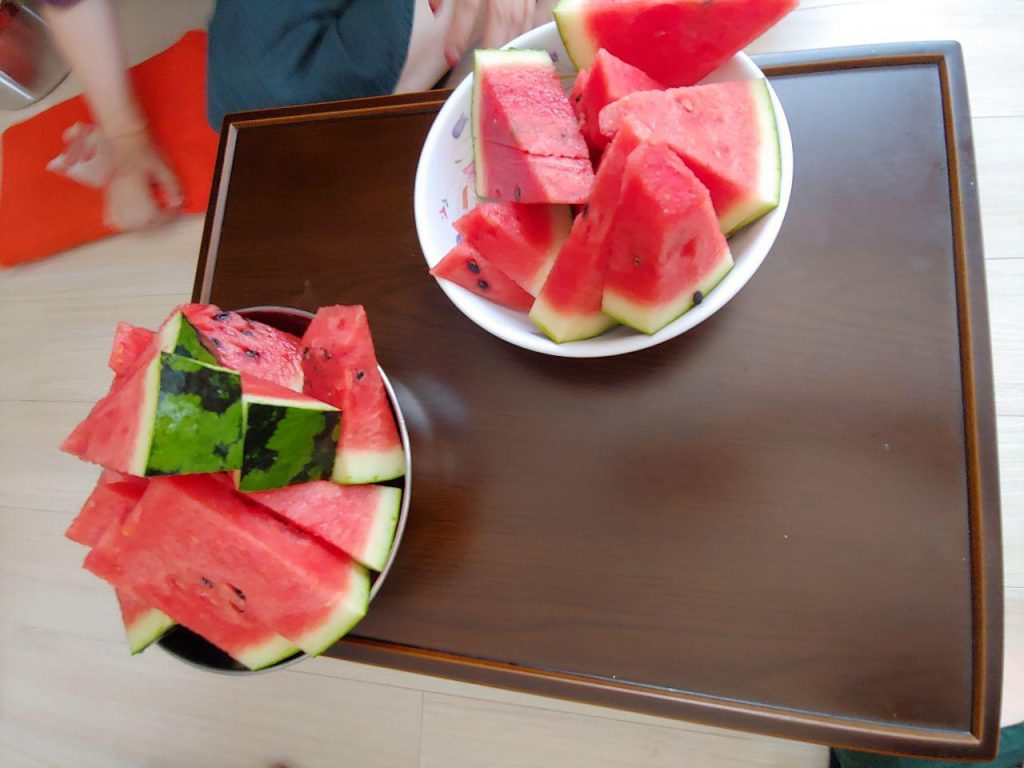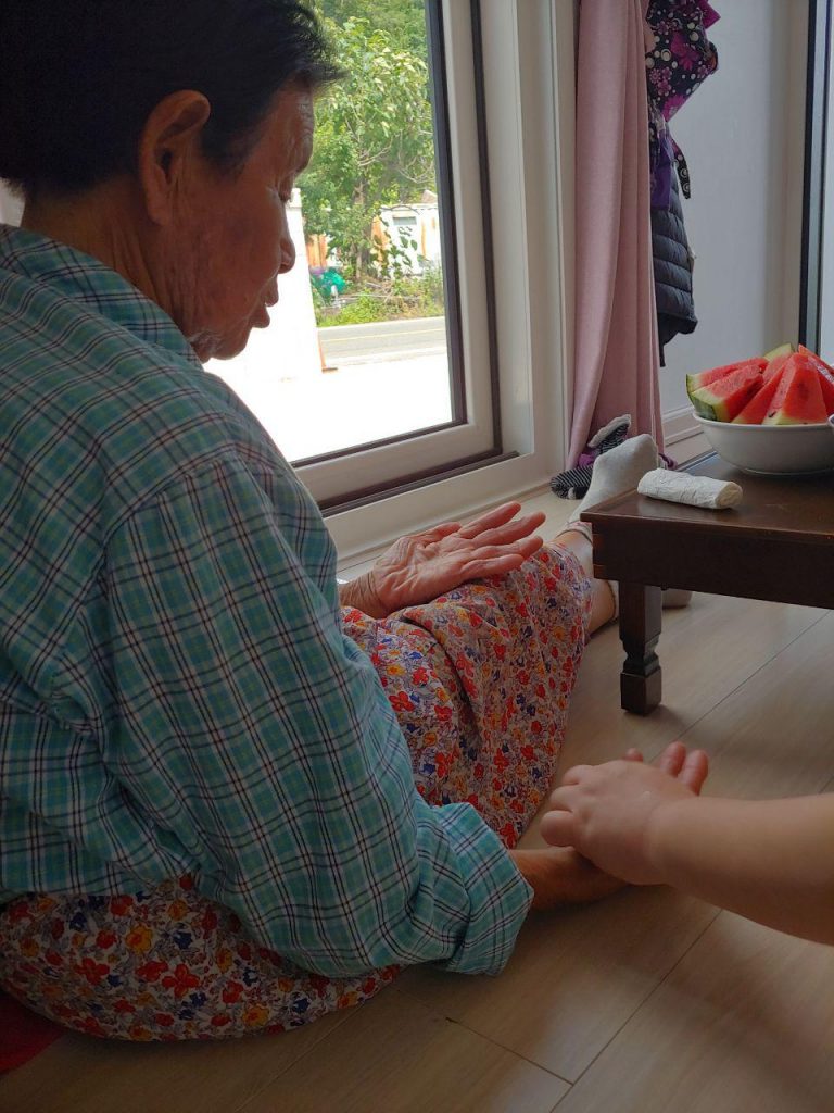 대구에 사시는 이OO 할머니는 다치셔서 누워 계십니다. 그래도 손잡고 반갑게 인사해 주시고 아드님에게 얼른 먹을 것 좀 내오라 하십니다. 식사도 잘하시고 건강해지려고 누워서지만 다리운동도 열심히 하신다고 합니다. 물리치료를 받으러 정기적으로 병원도 다니십니다. 점심때여서 아드님이 푸짐한 점심밥을 차려주셨습니다. 할머니와 함께 둘러앉아 맛있게 밥을 먹었습니다. 밥을 잡수실 때는 잠시 기대어 앉아 잡수십니다. 밥이 맛있게 되었다며 잘 잡수시는 모습을 보니 반갑습니다. 점심을 다 먹고 아드님과 요양보호사님도 식사를 하셔야 해서 인사드리고 일어서려 하니 수박도 먹고 가라며 손을 강하게 잡고 안 놓아주십니다. 또 수박을 먹으며 이야기 나눕니다. 다른 지역 할머니들도 잘 계시는지 물으시고 할머니 자식들, 손주들 이야기도 하십니다. 8월에 또 뵙기를 기약하며 건강하시라 인사드렸습니다.