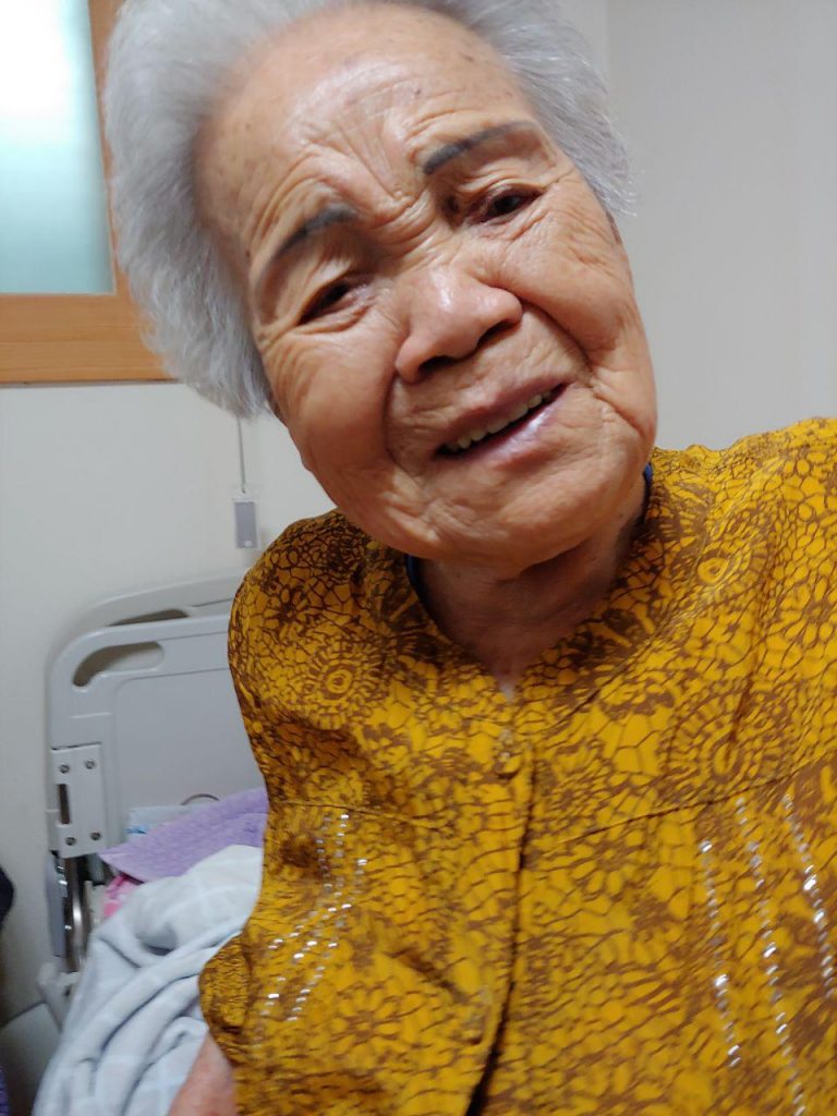 정복수 할머니는 여전히 쩌렁쩌렁 큰 목소리로 말씀도 하시고 노래도 부르십니다. 간호하시는 분이 이분들 어디서 오셨어요? 여쭤보니 조금 생각하시다가 “저희 집에서 왔겄지.” 하셔서 다 같이 웃었습니다. 얼굴빛이 맑으시고 건강도 좋아 보이십니다.