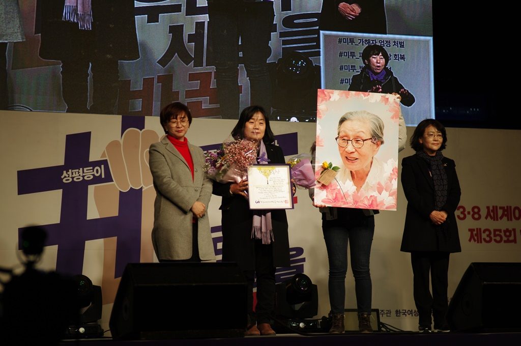한국여성단체연합은, 일생을 여성인권 향상과 여성운동의 발전을 위해 기여하였고 ‘전시성폭력 문제를 국제적 인권이슈로 이끌어 온 평화여성인권운동가 김복동’ 님에게 이 상을 수여한다고 전했습니다.