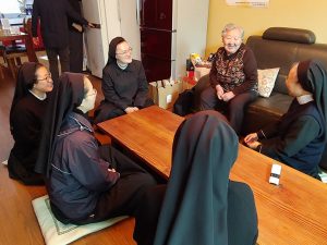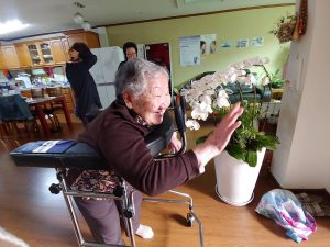 오늘 쉼터 평화의 우리 집에는 영원한도움의성모수도회 수녀님들이 방문하셨습니다. 딸기와 바나나를 잔뜩 사들고 오신 수녀님들은 길원옥 할머니와 마주하고 앉아 도란도란 이야기 나누었습니다. 가수이신 원옥 할머니와 같이 노래하려고 <목포의 눈물>과 <바위처럼> 노래 악보를 복사해 연습도 해오셨답니다. <남원의 봄 사건>을 비롯해 할머니 노래가 죽 이어지고 수녀님들도 같이 노래를 부릅니다. 그 소리가 참 평화롭고 좋습니다. 원옥 할머니 선물로 예쁜 모자와 몸에 좋은 들기름도 가져오셨습니다. 원옥 할머니 바로 모자랑 들기름 광고 찍으셔야겠습니다. 같이 소장님과 주임님이 끓여주신 떡국을 맛있게 먹고 딸기도 먹고 난 뒤 또 한 번 노래가 이어졌습니다. 그리고 원옥 할머니 잠시 운동하며 노래하시는 동안 수녀님들은 2층 김복동 할머니 방에도 방문하여 할머니께 인사드렸습니다. 수녀님들이 할머니께 예쁜 봉투에 든 20만원을 드리고 나가시는 길 원옥 할머니께서 웃으며 손 흔들어 주십니다.