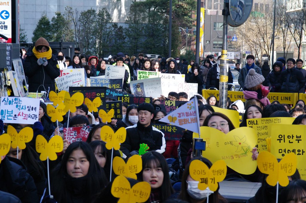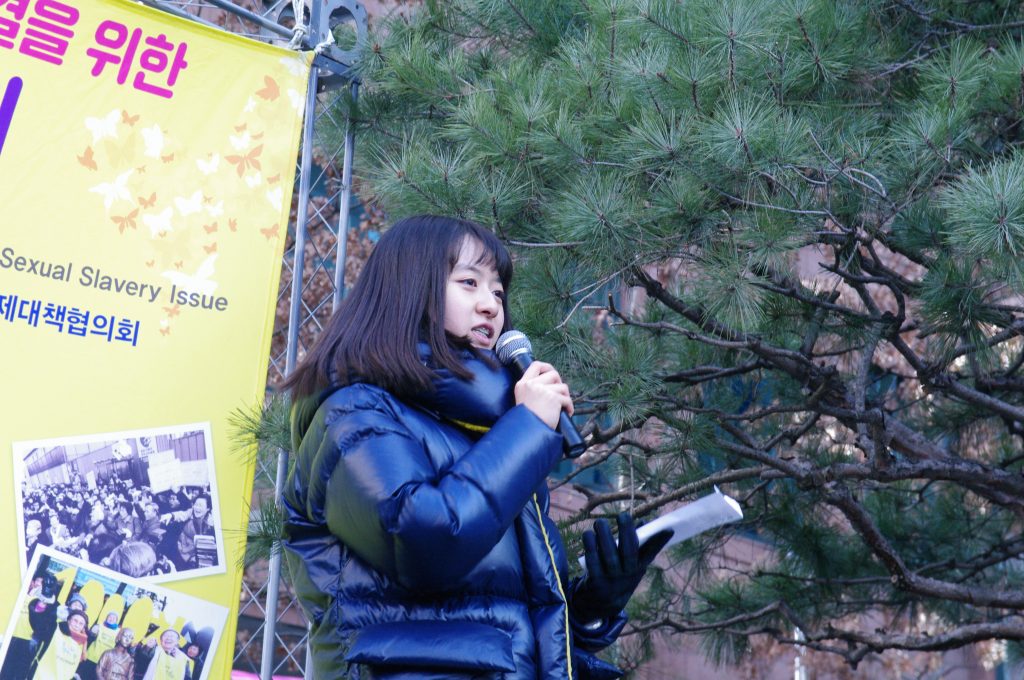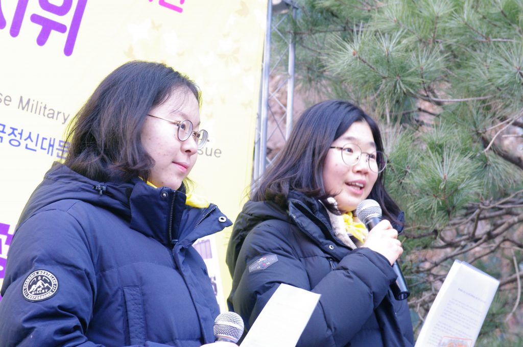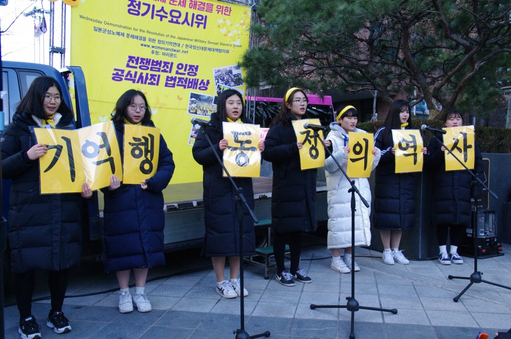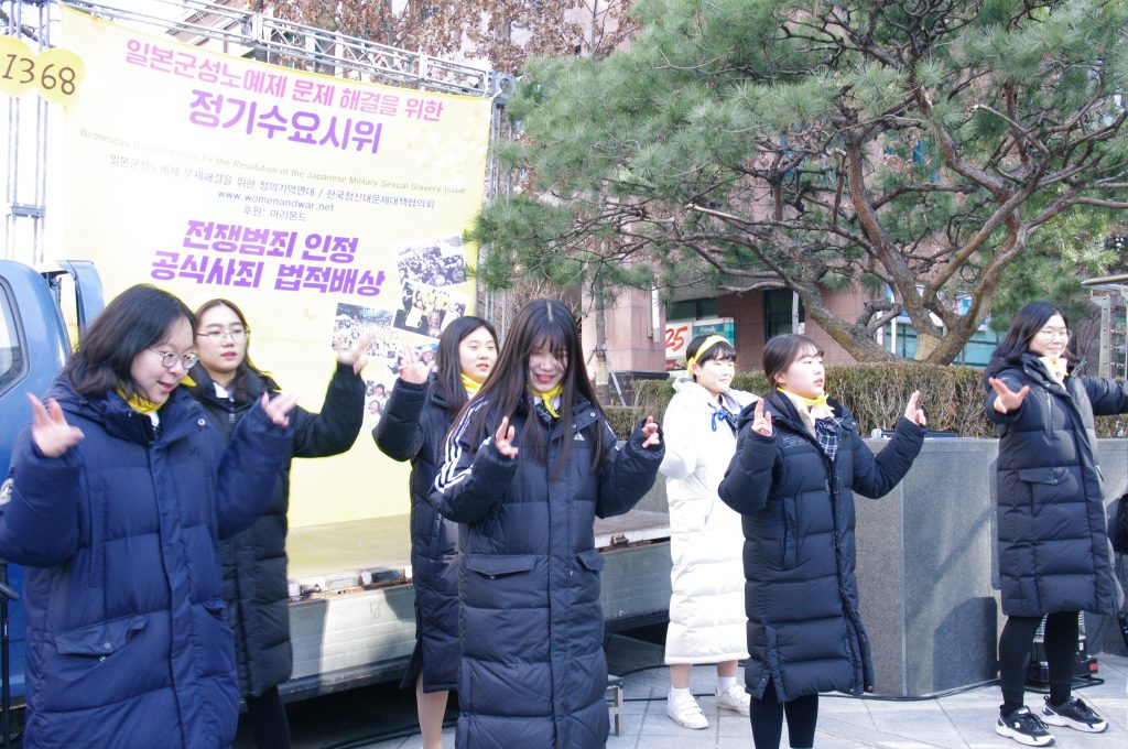 1368차 일본군성노예제 문제해결을 위한 정기 수요시위는 이화여고 역사동아리 주먹도끼 주관으로 진행되었습니다. 경기청소년평화나비, 양평중학교, 동아여자고등학교, 익산 이리고등학교, 백신고등학교, 부안여자고등학교, 양재고등학교, 성남 금광중학교, 청심국제중학교 동아리 유니원, 혜화여자고등학교 동아리 리네, 평화나비네트워크, 충청평화나비, 국민대학교 평화의소녀상 건립추진위원회와 시민들 600여명이 함께 했습니다.