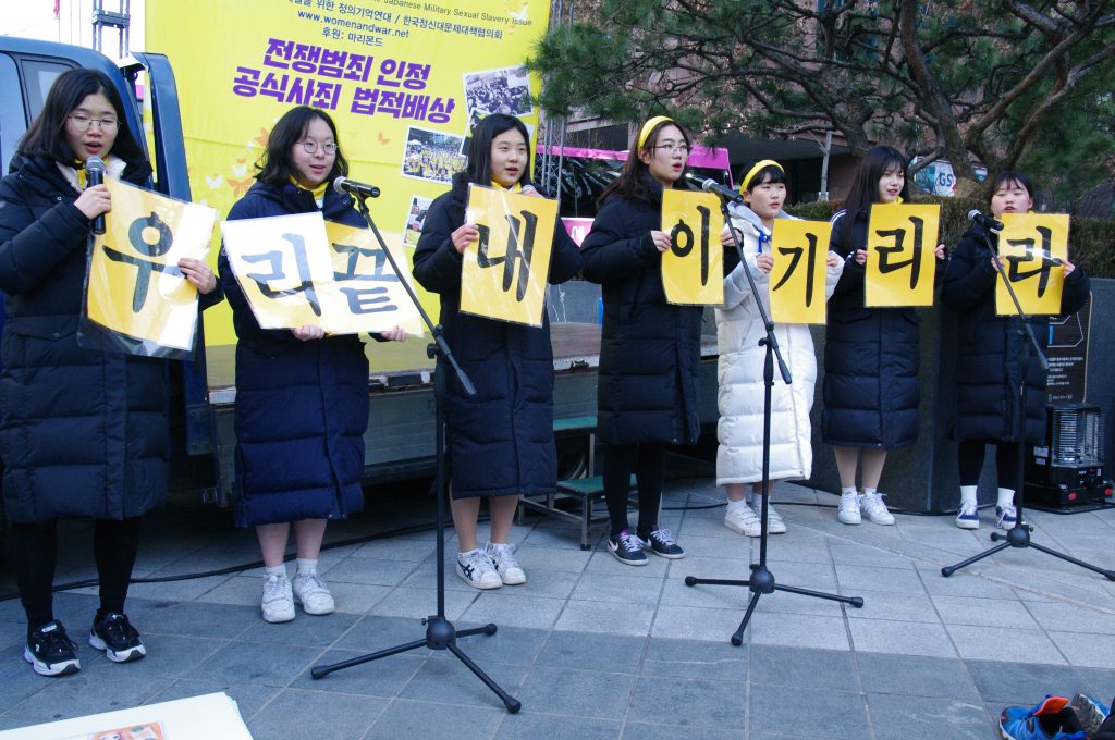 주먹도끼 1학년 학생들의 여는 공연 <바위처럼>에 이어 주관단체 소개와 윤미향 정의기억연대 대표의 경과보고가 진행되었습니다. 문화공연으로는 주먹도끼 학생들의 <상록수>가 이어졌습니다. 학생들은 노래 중간 중간에 ‘기억 행동 정의 역사 우리 끝내 이기리라’ 피켓을 들며 일본군성노예제 문제의 정의로운 해결을 다짐했습니다.