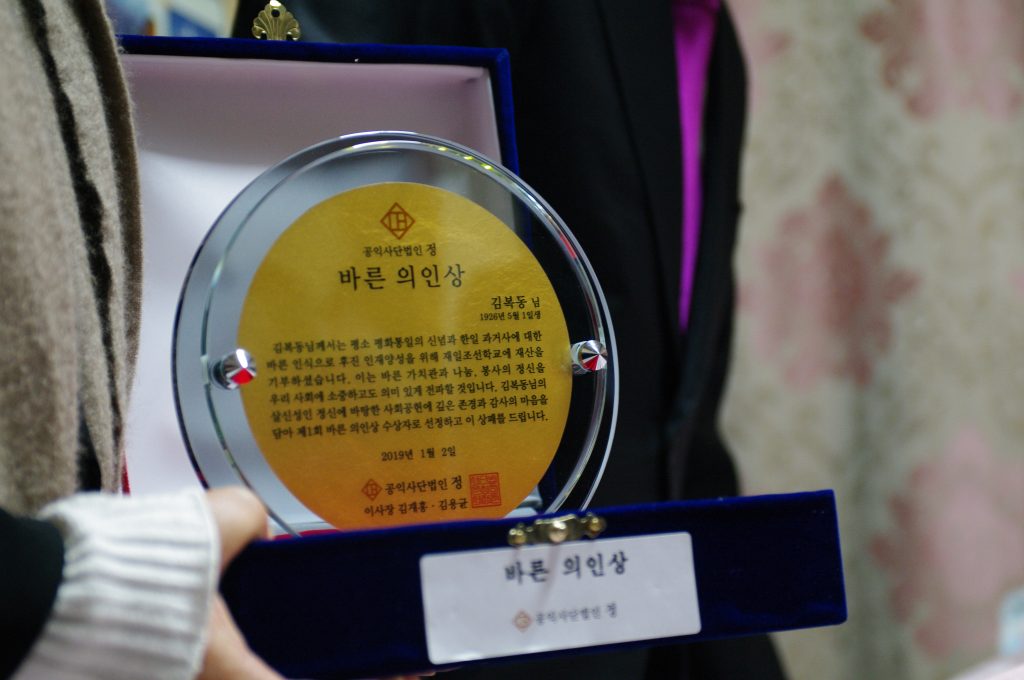 김복동 할머니께서 1회 바른의인상을 수상하셨습니다. 바른의인상은 공익사단법인 '정'이 마련한 상으로 김복동 할머니께서 일본군'위안부'피해자로서 아픔을 안고 있으면서도 전 재산을 미래세대의 교육을 위해 기부하고 평화와 통일의 신념으로 한일 과거사에 대한 바른 역사관을 전파시켰다며 선정 이유를 밝혔습니다.