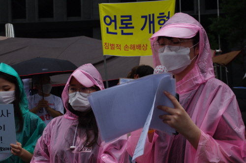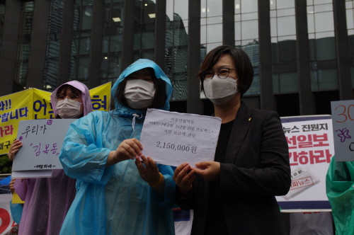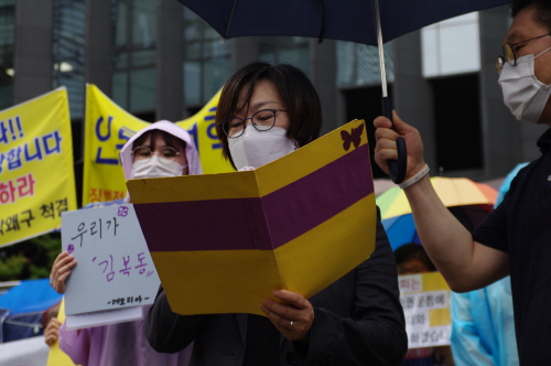 이어 대학생 동아리 역동에서 후원금을 전달하는 시간이 있었습니다. 그리고 정의연 이나영 이사장의 주관보고 후 참가자 소래, 마지막으로 기자회견 성명서 낭독을 끝으로 1451차 수요시위 기자회견은 마무리되었습니다.