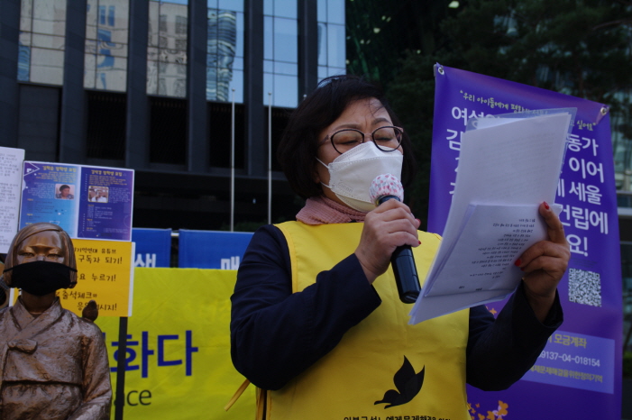 일주일 후면 국회의원 선거다. 약 10개 당에 정책질의서를 보냈다. 첫 번째, 성평등기금에 편성된 일본정부의 위로금 10억원 반환에 대한 입장이다. 2015한일합의의 산물인 화해치유재단이 2019년 6월 해산조치가 되었지만 아직 10억엔은 성평등기금에 묶여 있다. 이것을 반환해야 한다. 이 반환 노력을 각 당이 적극적으로 할 것인가에 대해 정책질의를 했다. 두 번째, 날로 심각해지는 일본정부와 국내 극우 역사학자들의 일본군성노예 문제에 대한 역사왜곡이 피해자에 대한 인권, 명예 훼손에 대해 적극적으로 대응하고 파편적으로 진행됐던 개별 연구자료들을 취합, 정리하고 체계적으로 사료를 발굴하고 연구 조사사업을 하기 위해 현재 일제하일본군‘위안부’피해자에 대한 보호지원 및 기념사업 등에 대한 법률을 개정해서 여성인권평화재단 설립에 대한 내용을 법률안에 넣어 국회에 상정해 놓고 있는데 심의조차도 안 되고 있는데 다음 국회 때 이것에 대해 적극적으로 입법활동을 할 것인가에 대해 물었다. 마지막으로 지금 양옆에서 계속 시끄러운데, 강성현 교수가 반일종족주의에 대해 반박하는 내용을 담은 <탈진실의 시대, 역사부정을 말하다>라는 책에서 외국 학자의 말을 인용해 이런 말을 했다. ‘사람들 각자는 자기의 의견을 가질 수 있다. 그러나 사람들 각자가 각자의 사실을 가질 수 있는 것은 아니다.’ 가자가 의견을 가질 수는 있지만 사실이 여러 개가 있는 것은 아니다. 사실을 왜곡해서는 안 된다. 왜곡된 사실을 기초해서 명예를 훼손하고 인격을 모독하고 역사를 부정해서는 안 된다. 이런 일들에 대해 어떻게 적극적으로 입법활동, 국회, 국가에서 역할을 찾는 것에 대해 적극적 활동을 할 것인가 물었다. 이 세 가지에 대한 질문을 하였고 어제까지 답변을 받았고 오늘 보도자료를 낼 것이다. 대체적으로 답을 준 정당들에서는 여기 대해 적극적인 활동을 하겠다는 답변이 왔는데 우리가 지켜보고 끊임없이 요구하고 함께하는 활동을 할 때만 가능한 일이다.”