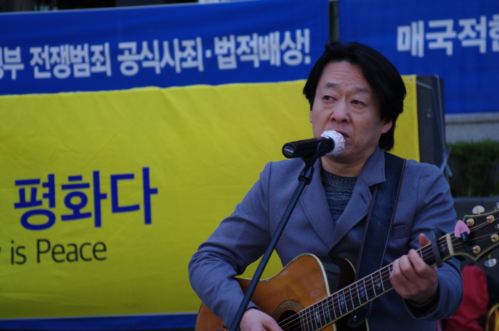 이어 평화의 노래 시간이 있었습니다. 가수 허영택 님이 <소녀>, 그리고 세월호 추모곡 <그대 앞에서>를 불러 주셨습니다. 그리고 한경희 정의기억연대 사무총장의 경과보고와 할머니 삶 소개 시간이 이어졌습니다.
