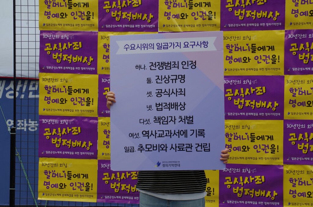 다시 한 번 일본 정부에 요구한다. 21세기 자유민주주의 경제대국으로서 일본국의 위상을 안으로부터 훼손하며, 역사의 시계를 거꾸로 돌리고 국제사회에서 스스로를 고립시키는 행위를 즉각 중단하라. 불법강점과 침략, 강제동원과 성노예제도를 거리낌 없이 감행한 전범국가로서 잘못을 솔직히 인정하고, 진정한 ‘정상국가’로 거듭나길 요구한다. 털어내지 못한 선조들의 책임은 후손에게 더 무거운 짐이 되어 얹어지고, 되풀이되는 부정과 부인의 정치는 미래세대의 부끄러움으로 되돌아온다. 선량한 일본 시민들이 무슨 낯을 들고 국제사회에서 여성인권평화를 이야기할 것인가.