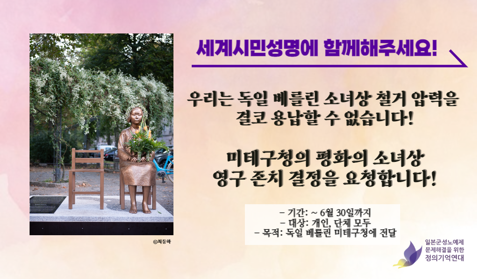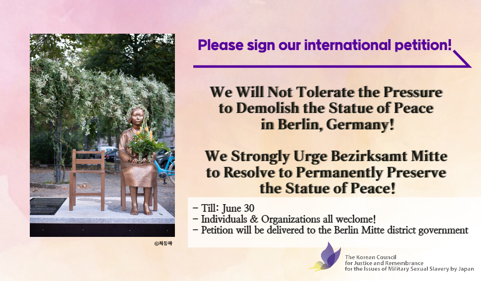 이에 다시 한번 세계 시민들의 서명을 모아 전시성폭력 문제의 상징이자 평화와 인권, 소수자, 약자의 연대의 상징이 되어온 소녀상을 지켜내고 세계 성폭력 근절을 바라고 염원하는 시민들의 마음을 모아 미테구청에 전달하고자 합니다.