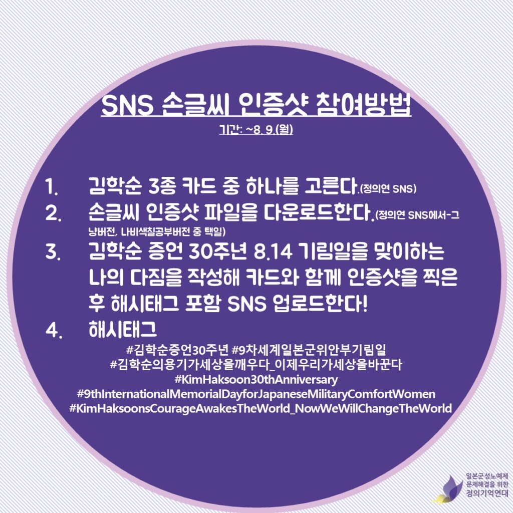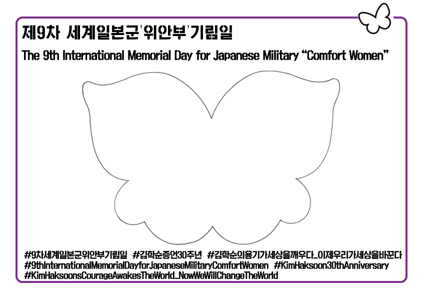 4. SNS 손글씨 인증샷 캠페인 참여 -캠페인 기간: ~8. 9.(월) -방법: 1. 김학순 3종 카드(사진+문구 이미지) 중 하나를 고른다. 2. 손글씨 인증샷 파일을 다운로드한다.(텍스트버전, 나비색칠공부버전 중 택일) 3. 김학순 증언 30주년 8.14 기림일을 맞이하는 나의 다짐을 작성해 카드와 함께 인증샷을 찍은 후 아래 해시태그 포함하여 SNS 업로드한다. -파일 다운로드 ( https://cdn.womenandwar.net/kr/김학순-증언-30주년-8-14 ) -해시태그: #김학순증언30주년 #9차세계일본군위안부기림일 #김학순의용기가세상을깨우다_이제우리가세상을바꾼다 #KimHaksoon30thAnniversary #9thInternationalMemorialDayforJapaneseMilitaryComfortWomen #KimHaksoonsCourageAwakesTheWorld_NowWeWillChangeTheWorld |