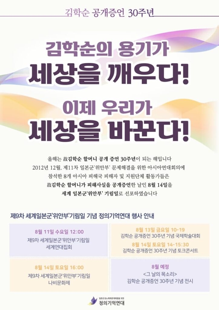 제9차 세계일본군‘위안부’기림일 맞이 세계연대집회 -8. 11.(수) 12:00 옛 주한일본대사관 앞 평화로/유튜브 라이브 | 김학순 증언 30주년 기념 국제학술대회 -8. 13.(금) 10:00~19:00 Zoom, 유튜브 라이브 -Zoom 참가신청: https://bit.ly/30conference -자세히 보기: 한국어 ( https://bit.ly/3eFsk7Q ) English ( https://bit.ly/3kIYBis ) 日本語 ( https://bit.ly/3BpTXf3 ) | 국제학술대회 부대행사_토크콘서트 ‘내가 기억하는 김학순’ -8. 14.(토) 14:00~15:30 Zoom, 유튜브 라이브 제9차 세계일본군‘위안부’기림일 맞이 나비문화제 -8. 14.(토) 16:00~17:30 Zoom(퍼포먼스 참여자), 유튜브 라이브(일반 참가자) | 김학순 증언 30주년 기념 전시 ‘그날의 목소리’개막 -8월 중 전쟁과여성인권박물관 |