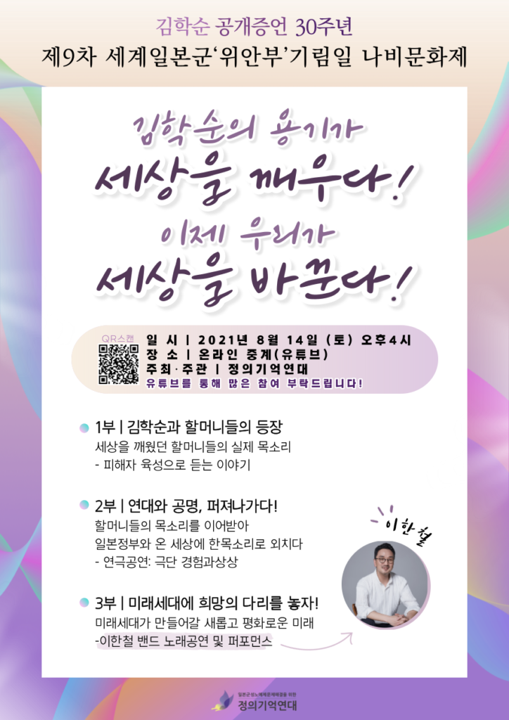 ○ 내용: 2021년 8월 14일은 김학순 피해생존자의 공개증언 30년이 되는 날입니다. 김학순의 용기와 증언은 다른 피해자들을 깨우고 더 큰 증언이 되어 시민사회와 국제사회를 움직였습니다. 일본군성노예제 피해자들의 용기와 인권, 평화운동가로서의 삶을 기리고 기억하기 위한 제9차 일본군‘위안부’기림일 나비문화제를 개최하려고 합니다. 문화제는 세상을 깨웠던 할머니들의 실제 목소리로 듣는 이야기, 연극, 노래공연 등으로 진행될 예정입니다. 또한 김학순 증언 30년을 돌아보고 기억하며 계승해 나갈 것을 다짐하는 자리가 될 것입니다. 모든 공연은 코로나19 확산 방지를 위해 온라인중계(유튜브)로 송출할 예정입니다.