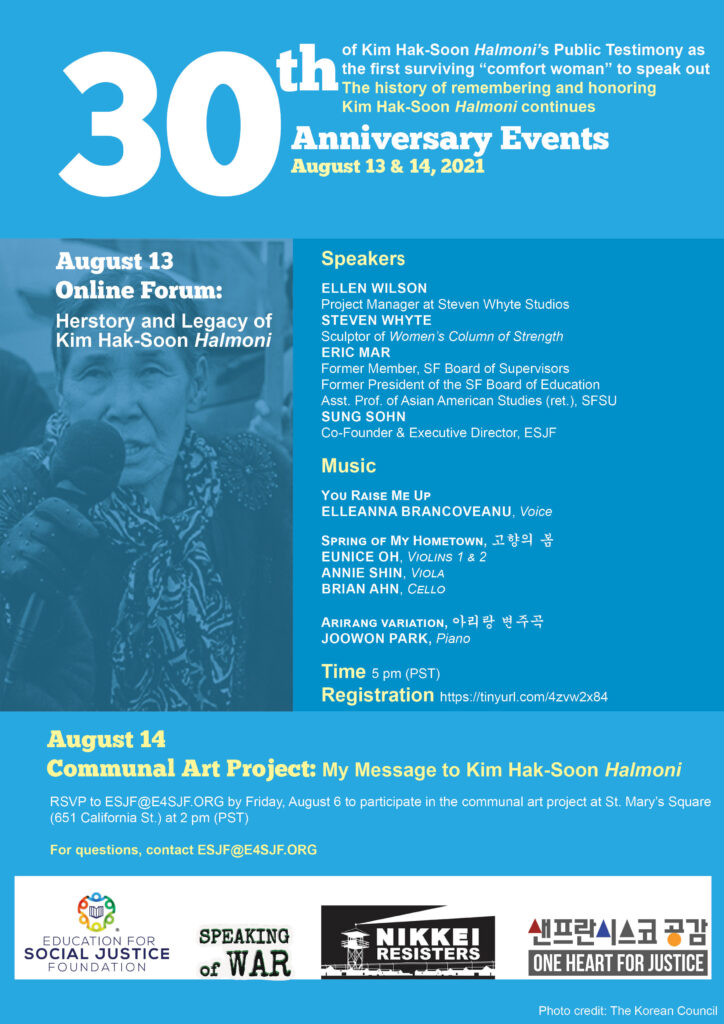 The Education for Social Justice Foundation is holding two events commemorating the 30th anniversary of Kim Hak-Soon halmoni’s public testimony: an online forum on August 13 and a communal art project on August 14.
