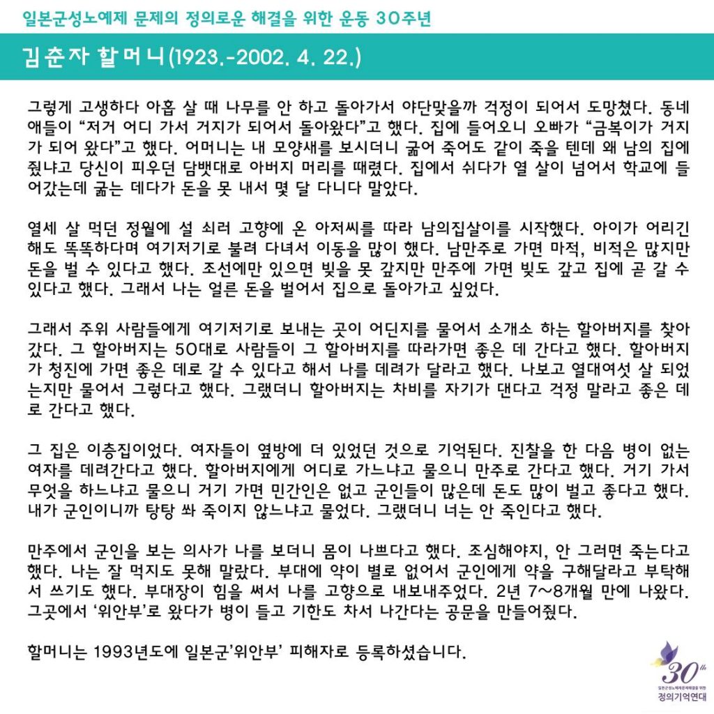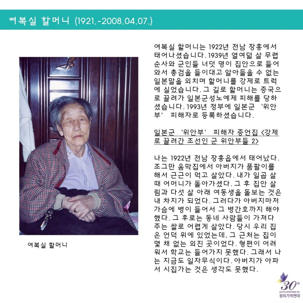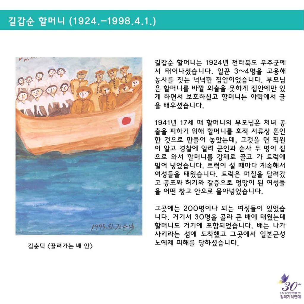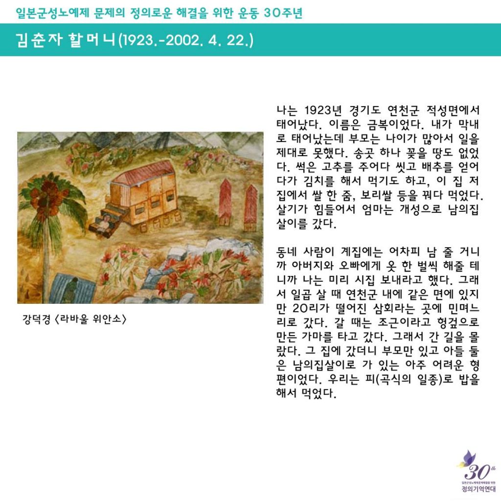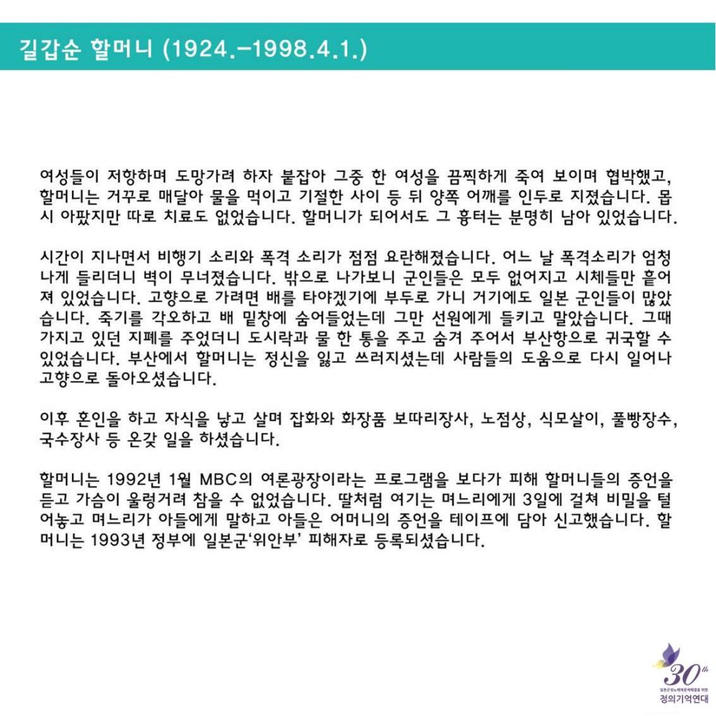 일본군성노예제 문제해결을 위한 정기수요시위에서는 <할머니의 삶>을 통해 일본군'위안부' 피해자들의 삶을 소개하고, 기억하고 있어요.