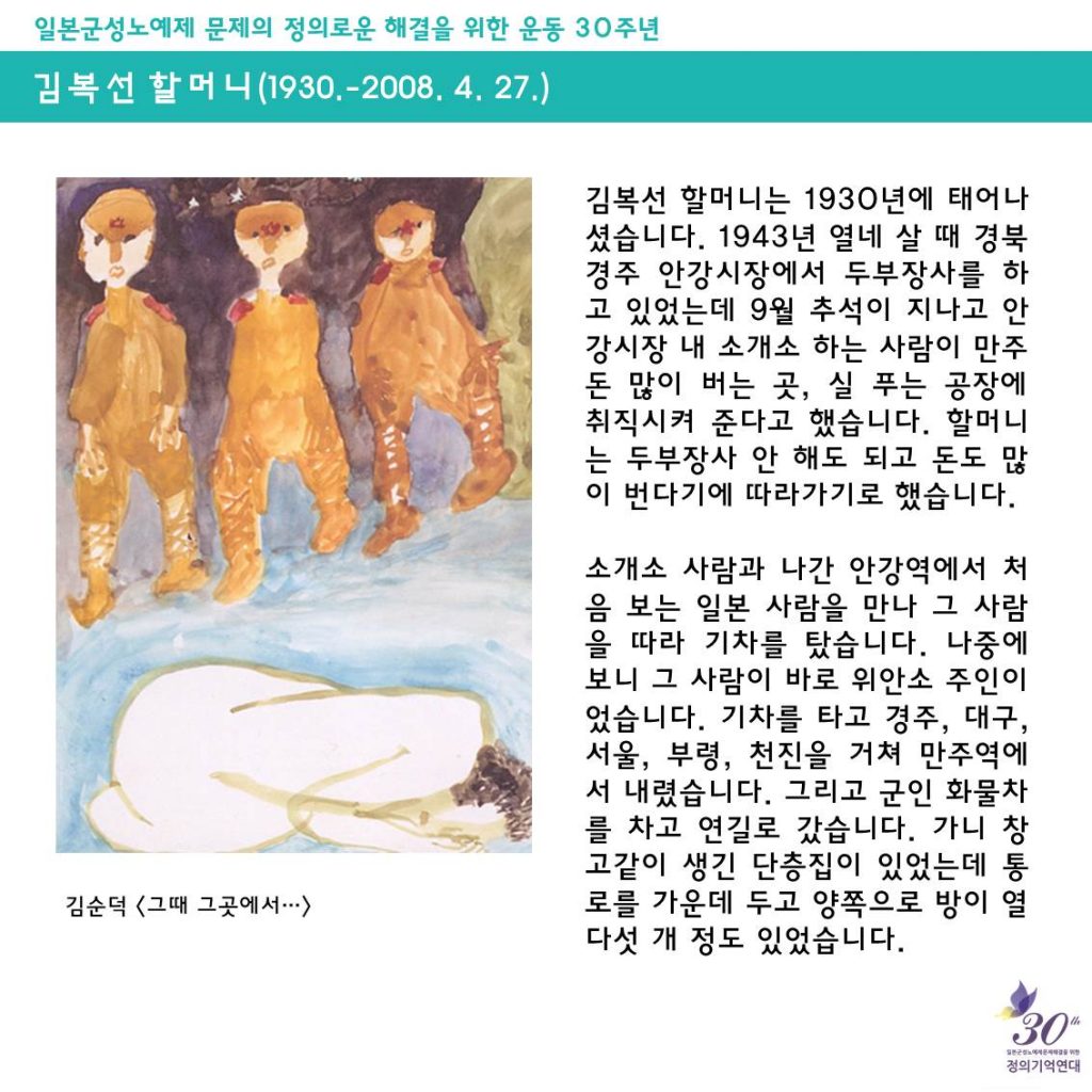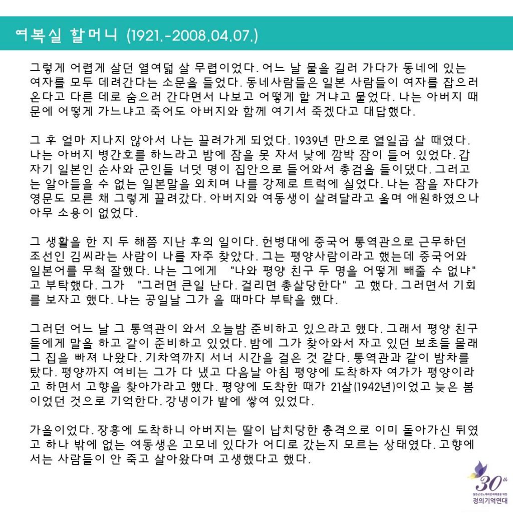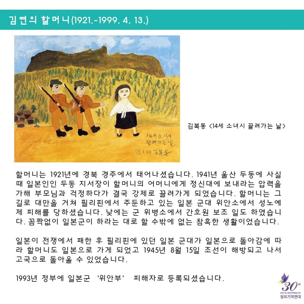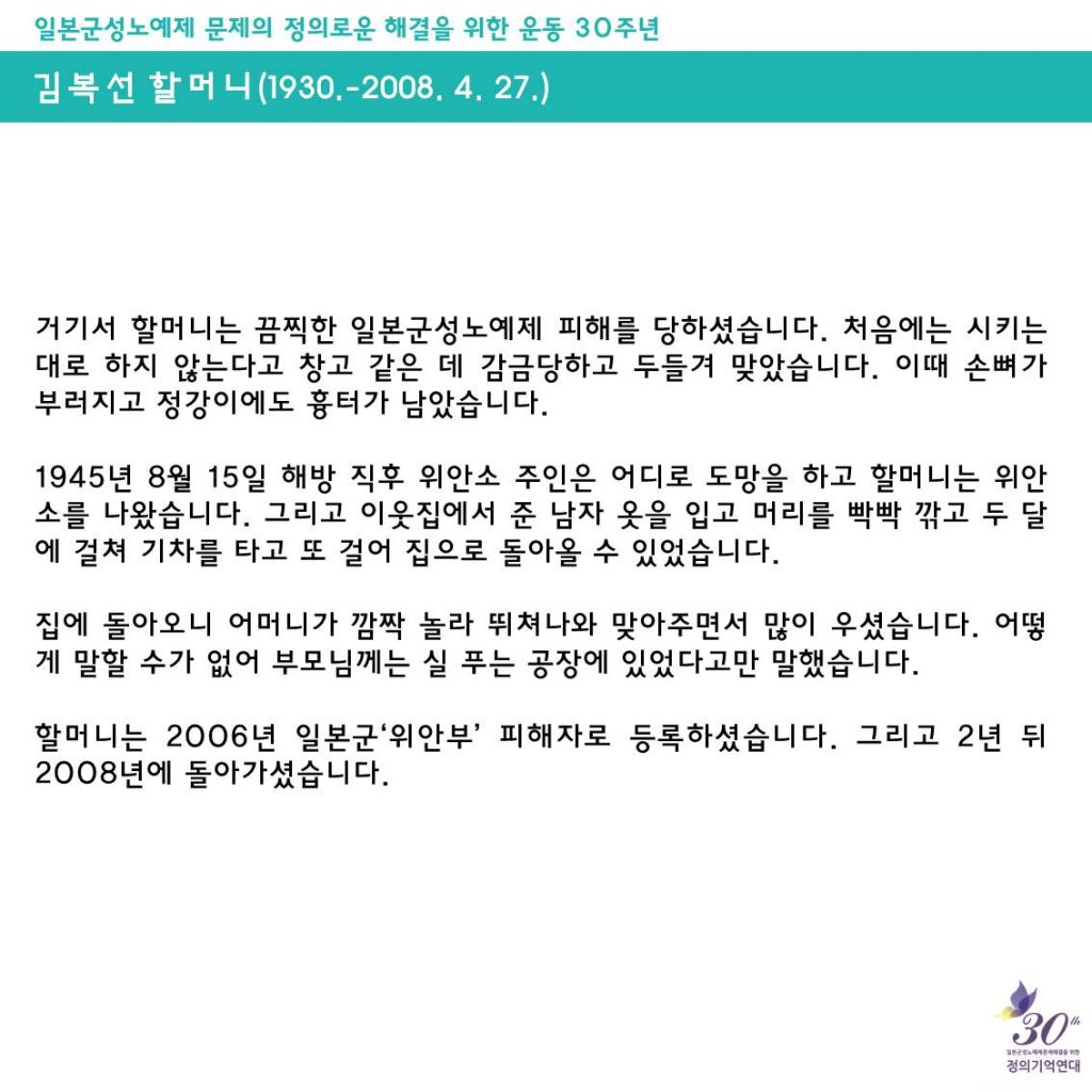 일본군성노예제 문제해결을 위한 정기수요시위에서는 <할머니의 삶>을 통해 일본군'위안부' 피해자들의 삶을 소개하고, 기억하고 있어요.