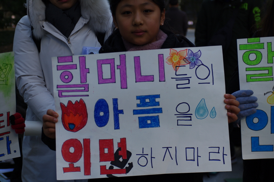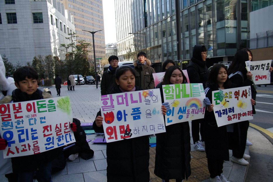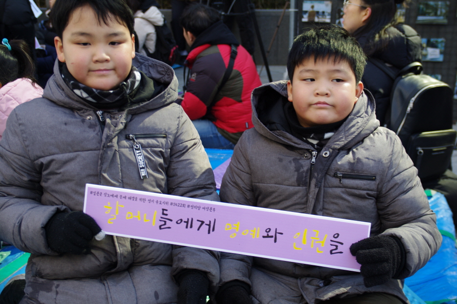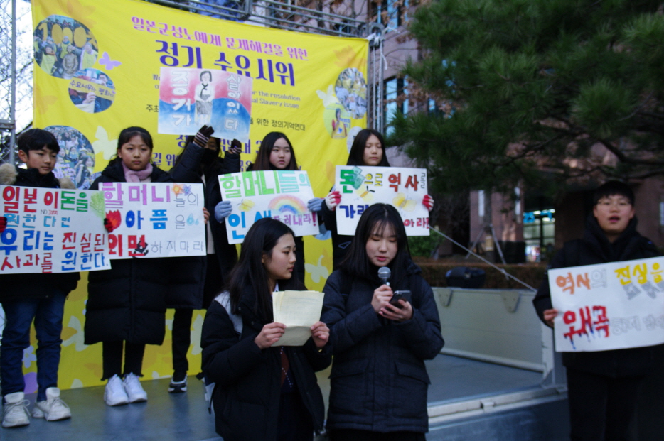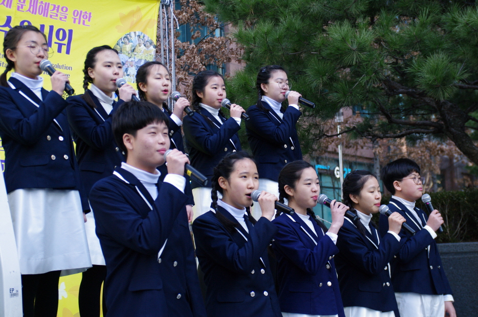 그리고 매년 초 수요시위에서 공연을 해주시는 어린이역사합창단 <아리랑>, <평화의 소녀상>의 합창공연 후 성명서 낭독을 끝으로 1422차 일본군성노예제 문제해결을 위한 수요시위는 마무리되었습니다.