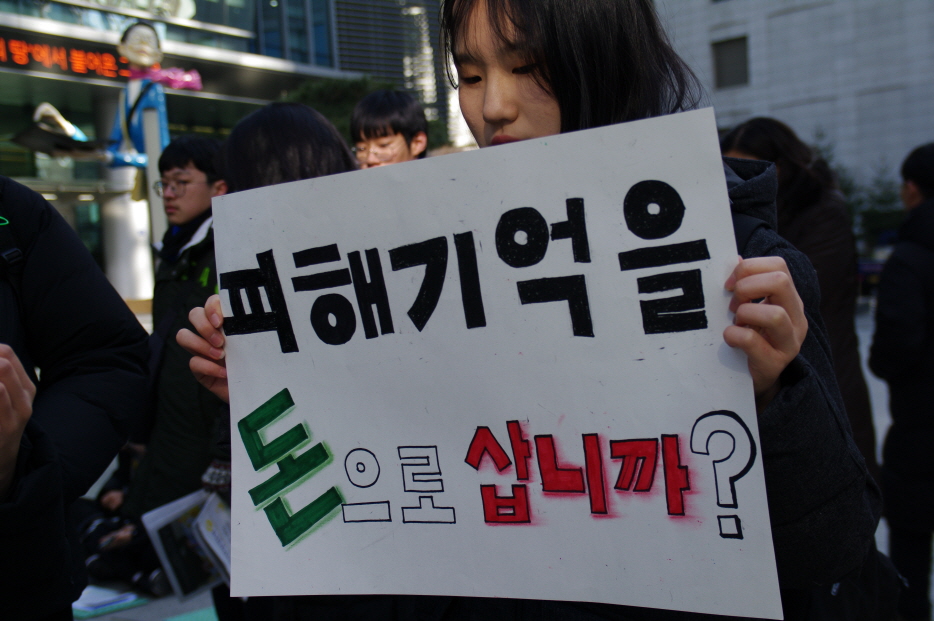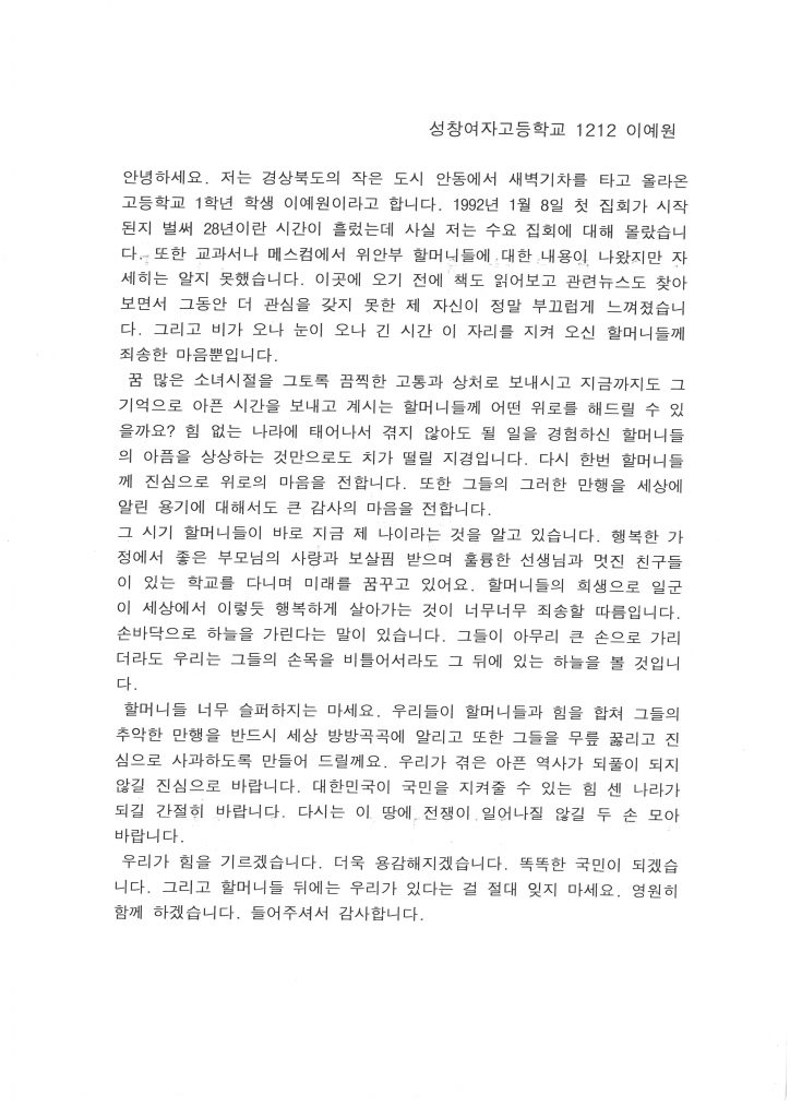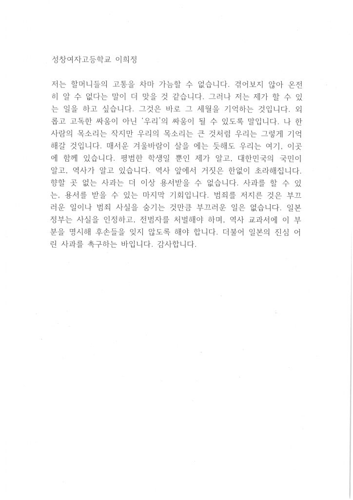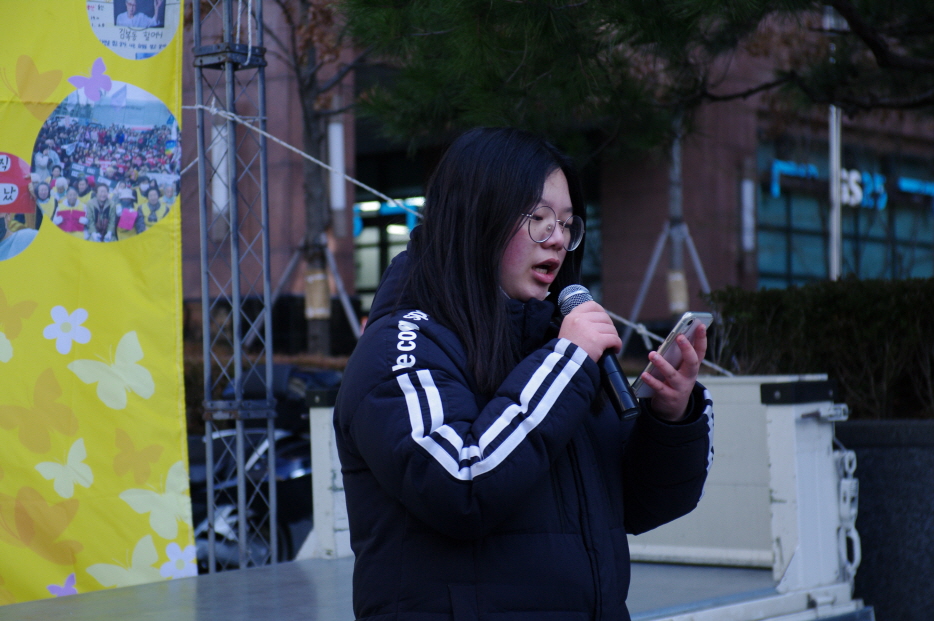 이어 기타리트스 데자뷰 님의 <가시리>, <진달래> 기타 공연 후 참가단체 소개와 자유발언이 이어졌습니다. 청년광장 윤세진, 성창여자고등학교 이희정, 이예원, 대전 생각교실 학원 배인영, 최지혜 학생의 자유발언이 있었습니다.