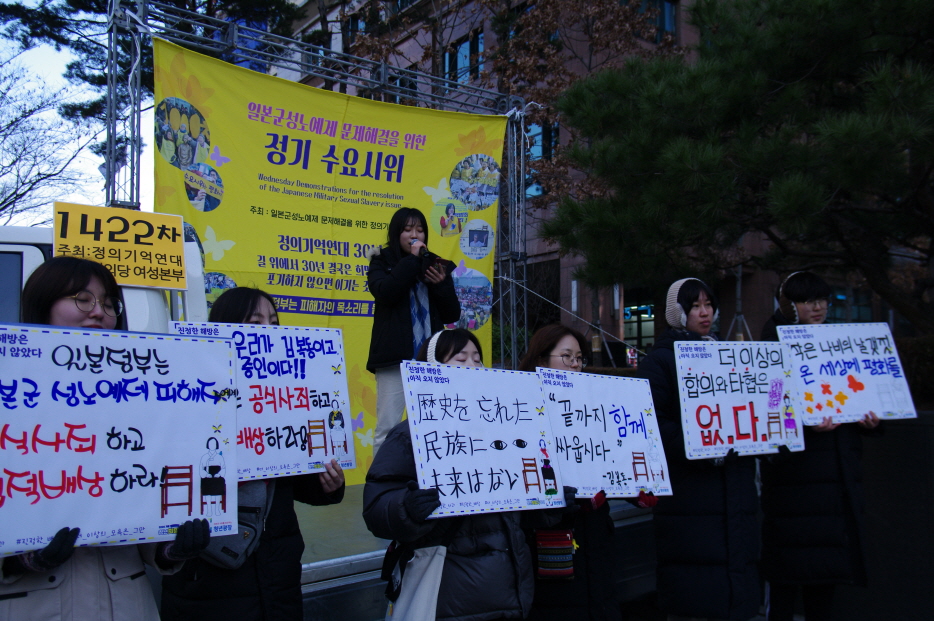 일본군성노예제 문제해결을 위한 1422차 수요시위는 정의당 여성본주의 주관으로 진행되었습니다. 청년광장, 안동 성창여자고등학교, 한국 풀뿌리학당, 양평 평화나비, 대전 생각교실학원, 최성미(어머니)·이진영·이지성 가족, 서울서부지역 청춘의지성, 비건지향 페미니스트와 친구들, 정읍여자고등학교, 마리몬드 <함께가는 수요시위> 참가자들, 서울 오류고등학교, 양산 서창고등학교, 국민대 평화의소녀상건립위원회 세움, 평택 라온중학교 역사동아리 수레바퀴, 안성 가온고등학교 역사동아리 세움, 대구 환경단체 어울림, 충청평화나비, 예산 덕산중학교, 주관단체인 정의당 부대표를 비롯한 집행부와 당원들, 그리고 개인적으로, 가족끼리, 친구와 함께 300여 명이 참가하였습니다.