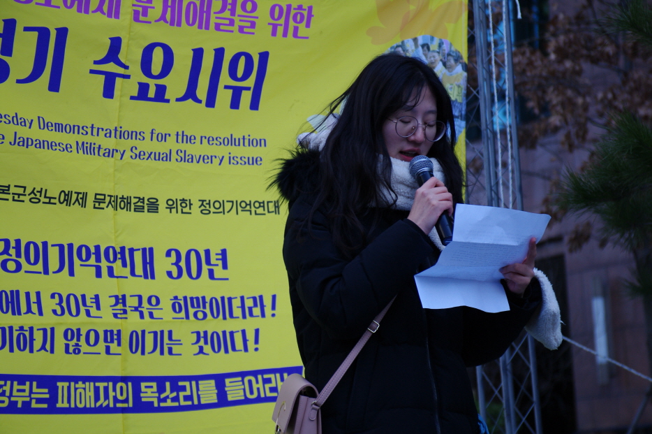 2000년 1월 16일 별세하신 김옥주 할머니 삶 소개 후 정의당 5기 광역시도당 여성위원장님들의 <바위처럼> 율동으로 수요시위가 본격적으로 시작하였습니다. 정의당 김종민 부대표의 인사말에 이어 정의기억연대 윤미향 대표의 경과보고가 이어졌습니다.