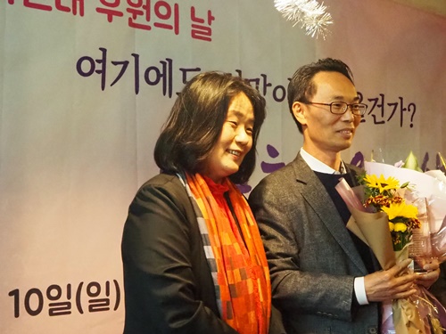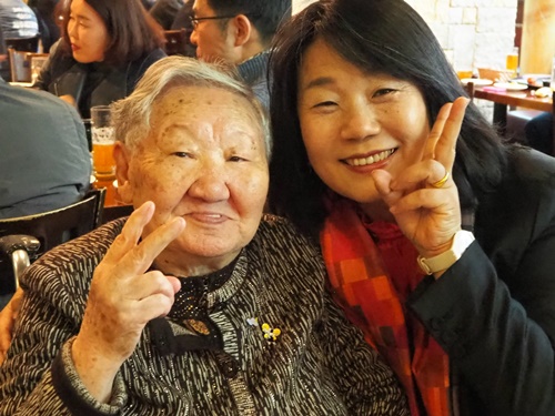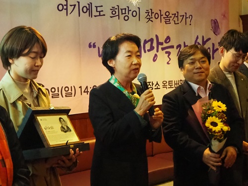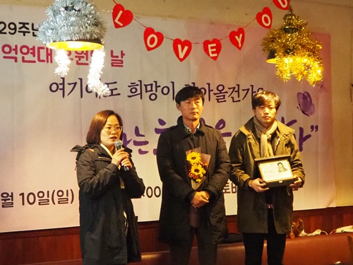 우리는 언제부터인가 소소한 행복을 누릴 수 있는 것만으로도 인권과 평화가 이루어질 수 있다는 것을 느끼게 되었습니다. <평화의 우리집> 건강지킴이 활동뿐 아니라 자매처럼 때로는 친구처럼, 놀이로, 식탁나눔으로, 나아가 할머니들의 희망을 실현해 가는 길에 든든한 후원자로, 활동가들을 향한 격려와 지지로 소소하면서도 너무나 소중한 부분까지 든든한 벗이 되어 준 연세의료원노동조합의 활동을 통해서 깨닫게 된 것이었습니다. 무엇보다도 김복동 할머니의 투병과 이별식 과정에서 연세의료원노동조합 노동자들이 보여주신 연대는 일본군성노예제 문제의 정의로운 해결을 향한 우리의 운동에 든든한 바위가 되어 주었습니다. 그 활동에 따뜻한 리더십을 발휘하며 일본군성노예제 문제의 정의로운 해결을 위해 우리와 함께 긴 세월 동안 길 위에 서 있는 권미경 위원장님께 고마움을 담아 감사패를 드립니다.