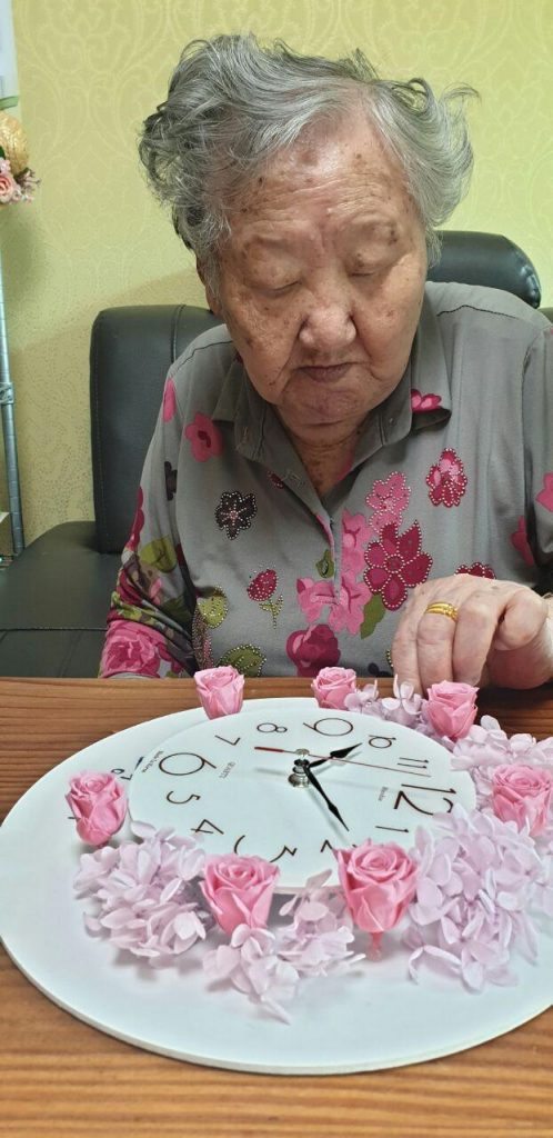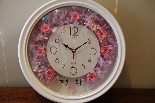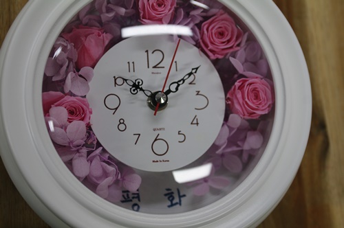 시계에 꽃들을 붙이고 평화라는 글씨도 쓰셨습니다.