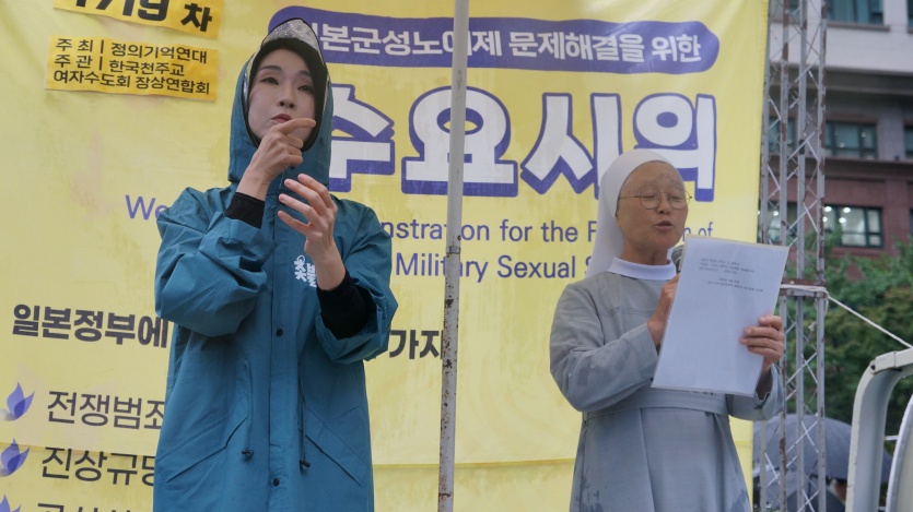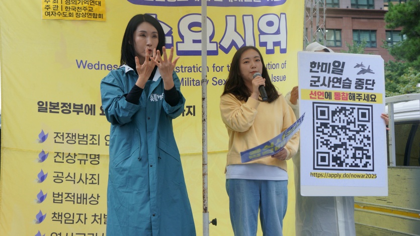 수요시위는 제가 대학생일 때부터 지금까지 저에게 용기와 인간의 존엄성, 그리고 평화에 대해 배우고 나눌 수 있는 소중한 공간입니다. 처음으로 발언도 할 수 있게 되어 감사합니다. 떨리네요.
