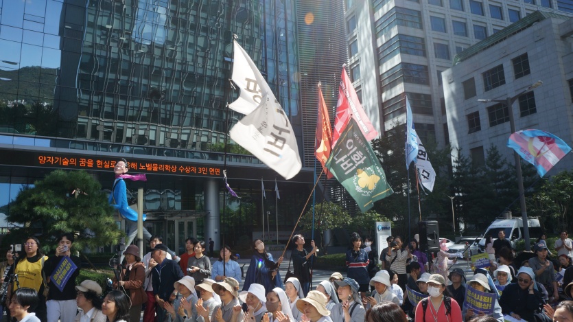 대학문화유니온과 참가자 전체가 함께 <우리는 가지요> 노래와 율동을 한 뒤 마지막으로 대학생기후행동 중앙집행부 한지원 님, 국제정치·외교 동아리 PAZ 동부크루캡틴 박성빈 님, 간호학생 네트워크 VITAL 운영진 강은비 님이 성명서 낭독을 하며 1721차 정기 수요시위가 마무리되었습니다.