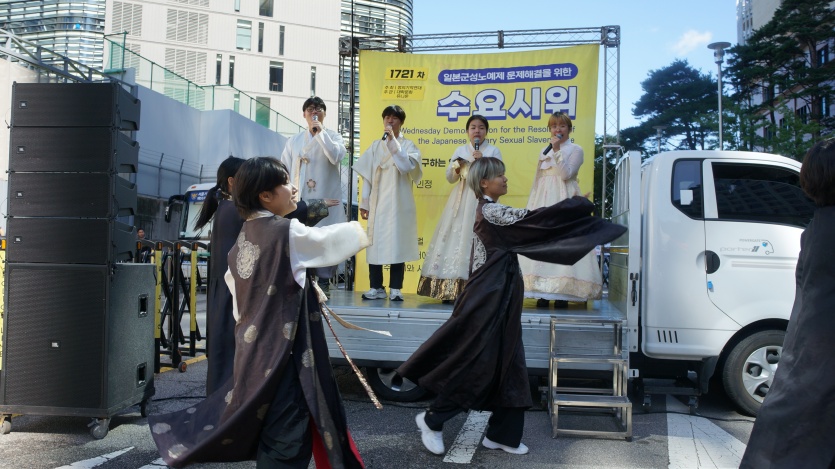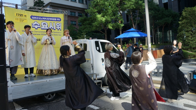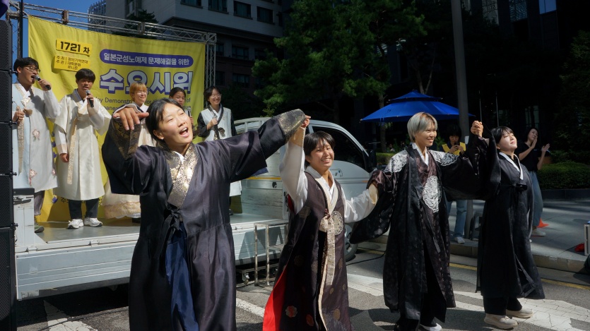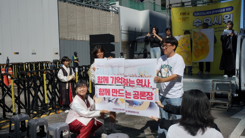 1721차 일본군성노예제 문제해결을 위한 정기 수요시위의 주관은 대학문화유니온에서 하였고 사회는 김소현 대학생기후행동 전국대표님, 장은아 평화나비네트워크 전국대표님이 보았습니다. 간호학생 네트워크 VITAL, 대학생기후행동, 시사경제 동아리 오코플로, 국제정치·외교동아리 PAZ, 문학기행 동아리 TRACE, 미디어비평동아리 호외, 평화나비 네트워크 등 다양한 동아리 연대체인 대학문화유니온 대학생들은 추석을 맞아 한복을 입고 수요시위에 임했습니다. 또한 추석 명절 연휴임에도 개인, 단체 등 많은 분들이 함께해 주셨습니다.