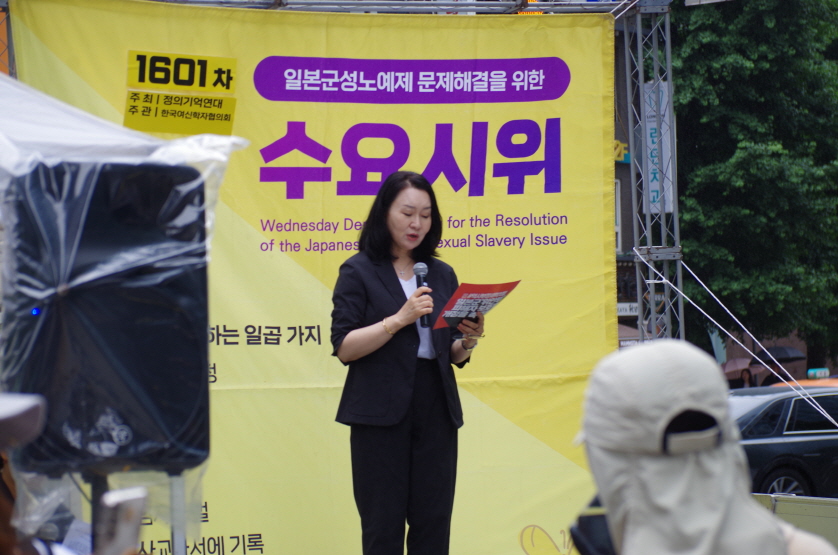 1601차 일본군성노예제 문제해결을 위한 수요시위의 주관은 한국여신학자협의회(여신협)가 하였고, 사회는 진미리 한국여신학자협의회 공동대표님이 보았습니다.