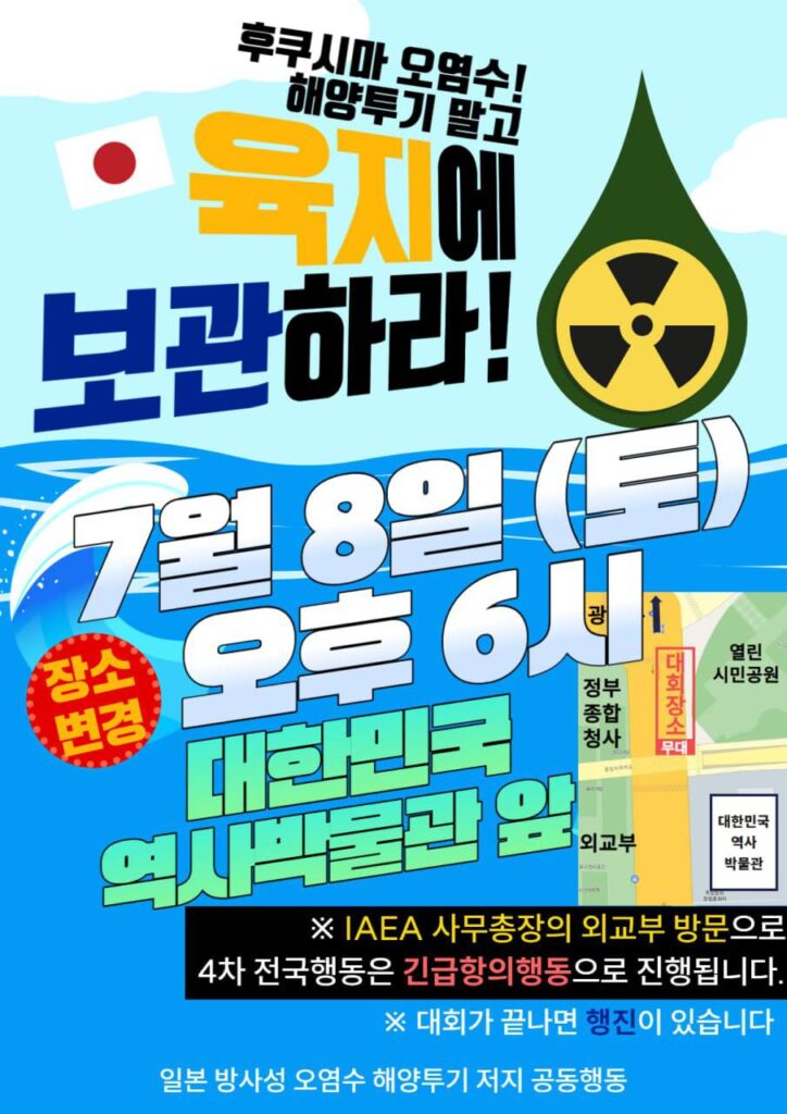 지난 7월 8일 (토) 18:00 ‘일본방사성오염수해양투기저지공동행동’은 대한민국역사박물관 앞에서 IAEA 사무총장 방한 대응 오염수 투기 저지 전국 행동의 날을 개최했습니다. 오염수 투기에 면죄부를 준 IAEA 사무총장에게 IAEA 최종보고서 폐기를 강하게 요구하고, 일본 오염수 투기를 사실상 찬성한 한국 정부를 규탄하며, ‘일본 국토 내 육상 장기 보관’과 ‘국제해양법재판소에 제소’할 것을 촉구하는 전국 행동이 열렸습니다.