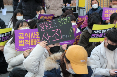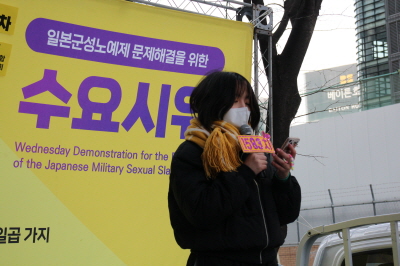 먼저 저의 얘기를 해보자면, 저는 처음에 일본군 ‘위안부’ 문제와 그 역사적 사실에 대해, 사실 잘 알고 있지 못 했습니다. 대학교 입학 후, 단지 인권에 관심이 있다는 이유로 평화나비에 들어왔고, 그랬기 때문에 수요시위를 한 번도 가본 적이 없었으며 잘 알지 못했습니다. 그러다 2021년 겨울, 처음으로 수요시위에 오게 되었습니다. 그런데 그날, 한 일본인 학생이 바로 이곳에서 발언을 했습니다. 그 학생은 한국의 역사를 더 공부하기 위해 일본에서 한국으로 왔고, 한국에 온 뒤로 계속 수요시위에 참여했으며 일본군 ‘위안부’ 문제가 하루 빨리 해결되기를 바란다고 했습니다. 2021년 추운 겨울, 수요시위에서 그를 만난 것은 저에게 전환점이 되었습니다. 수요시위라는 곳이 정말 국경을 넘어서 평화를 위해 우리가 평등하고 자유롭게 토론을 하고 더 나은 세상을 위해 이야기하는 곳이라는 것을 깨달았습니다. 그리고 그동안 바쁘다는 핑계로 수요시위를 미뤘던 제 자신을 반성하고 그 이후로 더 적극적으로 평화나비 활동에 참여했던 것 같습니다.