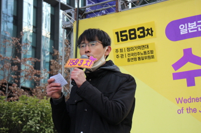 1583차 일본군성노예제 문제해결을 위한 수요시위는 전국민주노동조합총연맹 통일위원회 주관으로 진행되었습니다. 사회는 민주노총 대협실장 안혜영 님이 보았습니다.