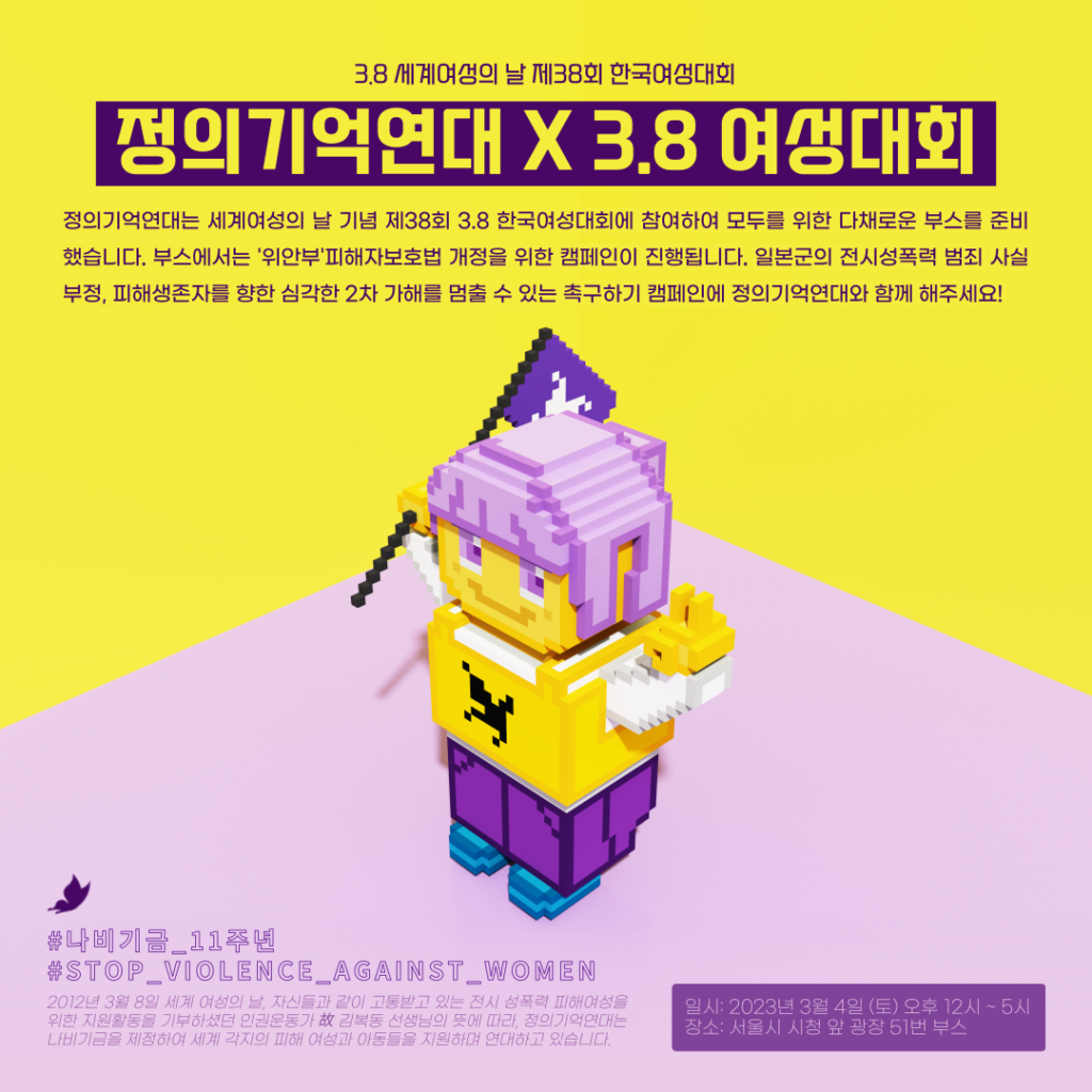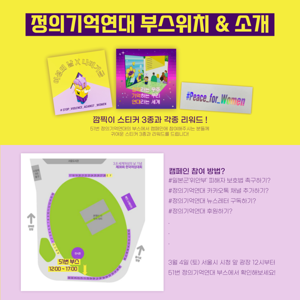 정의연은 51번 부스를 배정받아 일본군'위안부'피해자보호법 개정을 위한 부스를 엽니다. 일본군'위안부' 범죄 사실을 부정하고 피해자의 명예를 훼손하는 등 더이상 역사를 부정하지 못하도록 촉구하기에 함께 해주세요.