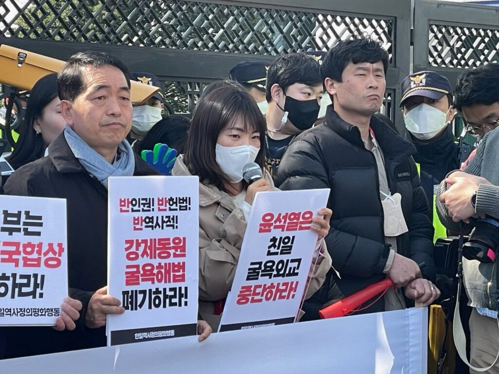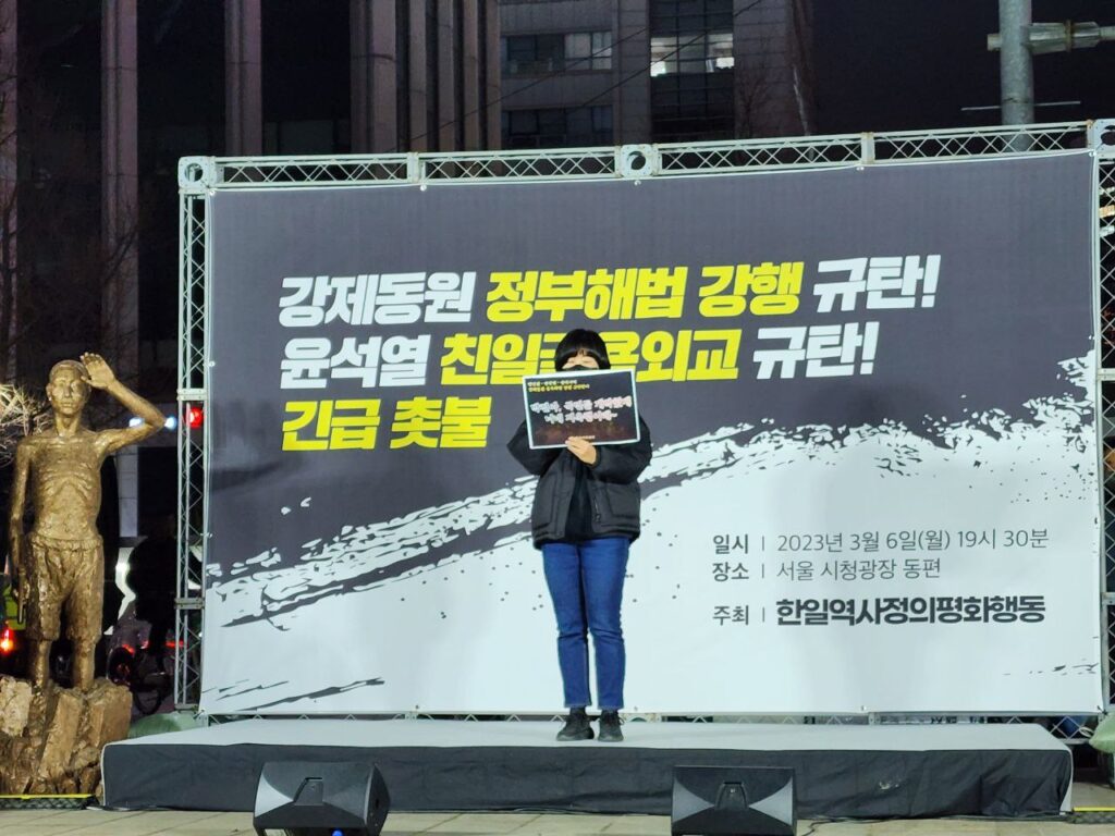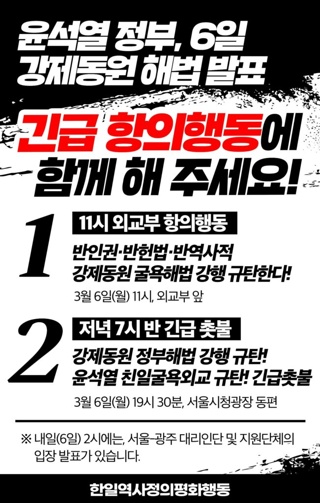 이에 한일역사정의평화행동은 다음과 같이 3월 6일 11시 외교부 앞 항의행동, 19시 30분 서울시청광장 긴급촛불 등 긴급 항의행동을 개최했습니다.
