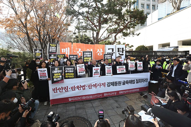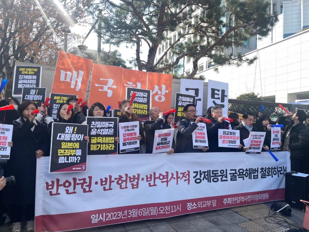 3월 6일, 윤석열 정부가 일본의 사죄배상 빠진 굴욕적인 강제동원 해법안을 기어이 공식 발표했습니다. 이 해법안에 대해서는 이미 수차례 강제동원 피해자와 대리인단, 시민사회단체와 야당 국회 의원들까지 반대 입장을 밝혀왔습니다. 그럼에도 윤석열 대통령은 해법안을 강행 발표하여, ‘1엔도 낼 수 없다’는 일본에 나서서 면죄부를 부여하려고 하고 있습니다. 게다가 피고기업의 배상 대신 한일 경제단체가 기금을 조성하여 미래세대에게 ‘장학금 지급’을 하겠다는 것은 그야말로 역사를 우롱하고 기만하는 행위가 아닐 수 없습니다. 전범 기업은 한푼도 안내는 일본 정부의 완승이며 최악의 외교참사입니다.