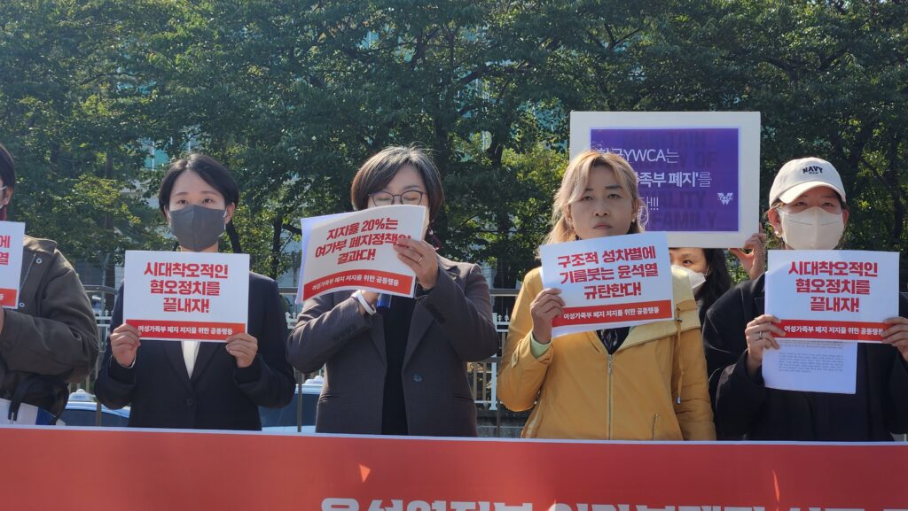 윤석열 정부는 여성가족부 폐지 시도를 즉각 중단하라. 여성가족부 폐지로 국면 전환을 꾀하지 말라. 여성가족부 폐지해도 지지율은 상승하지 않으니 헛된 꿈을 꾸지 말며 여성의 인권을 침해하지 말라.