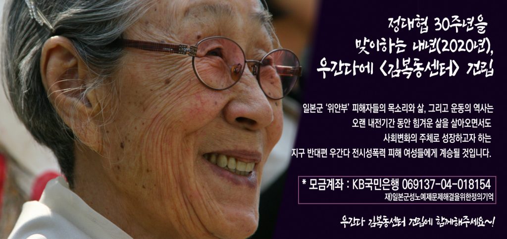 길원옥 할머니가 6월 19일 1392차 수요시위 현장에서 가장 먼저 500만원을 기부하시면서 첫 기부자가 되셨고, 이용수 할머니께서도 기부의사를 밝히셨습니다. 우리 모두가 일본군‘위안부’피해자와 우간다 전시성폭력 피해 생존자들의 연대에 지지를 보내고 연대를 보여줌으로써 전시성폭력 종식과 재발방지를 위한 시작을 김복동 센터로 열었으면 합니다. 부디 목격자이자 주체자로 함께 해 주시길 당부드립니다. 여러분들의 참여를 기다립니다.