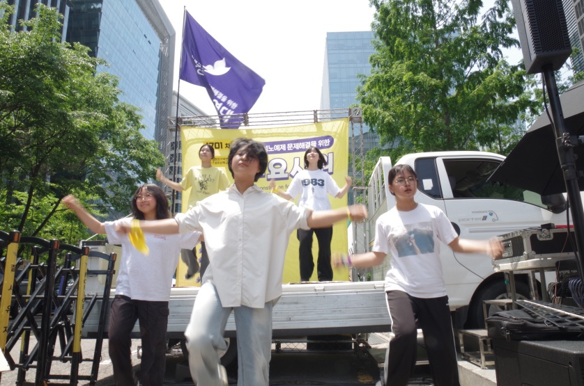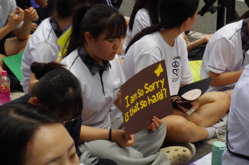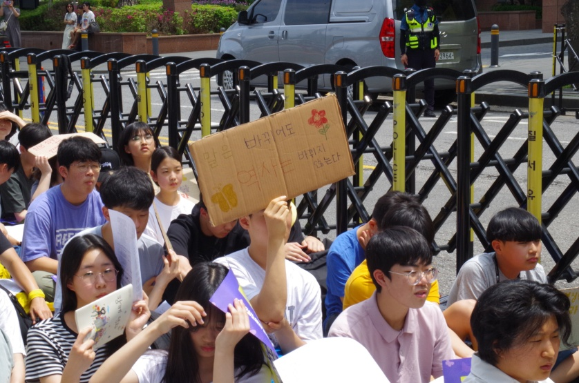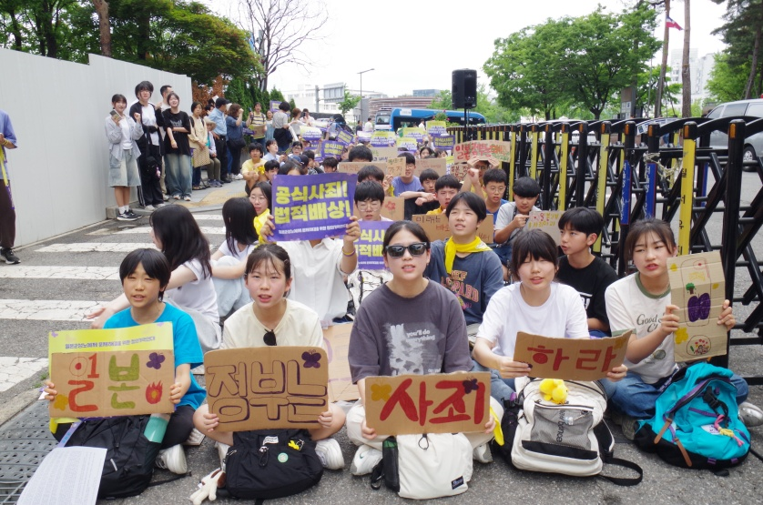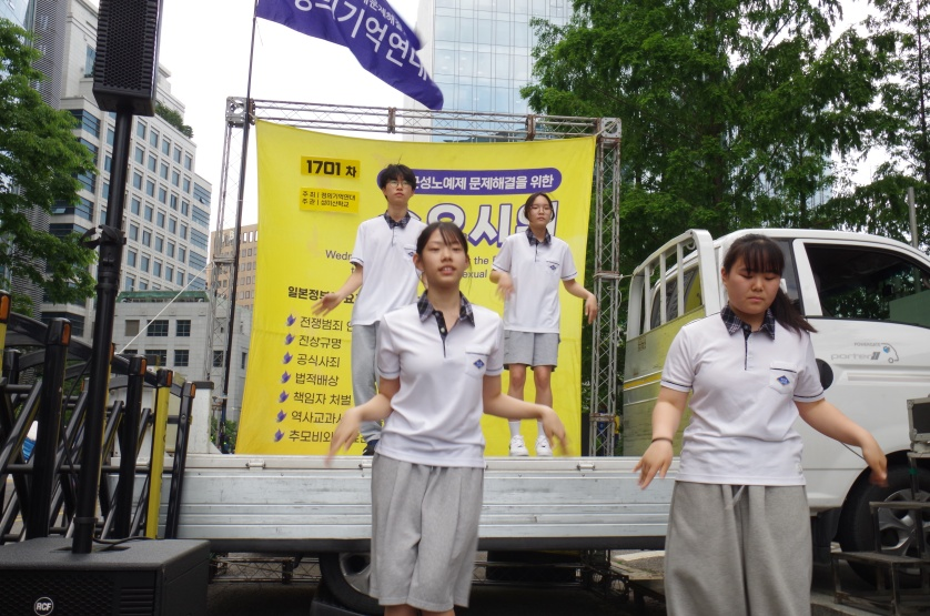 ソンミ山学校の生徒会は、2022年から年に1回、1545回目、1596回目、1647回目、そして今日の1701回目まで、4回の水曜デモを主催し、日本軍性奴隷制問題解決のための運動に連帯してきた。依然として日本政府は日軍性奴隷制問題の解決に消極的な態度を取っており、韓国政府も同様だ。30年を超える時間が経ち、1700回を超える水曜デモが日本大使館前で行われてきたにもかかわらず、いまだに問題解決は実現していない。しかし私たちは、今後もより一層、日軍性奴隷制問題解決のために声を上げ、行動していく決意を込めて、この声明を発表する。