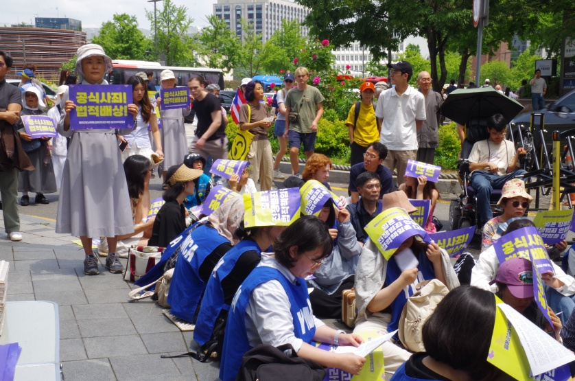 私たちは自ら立ち上がり、互いを救う方法を学びながら、誰もが平和に共存できる世界を作る道を模索し、行動している。その道の先には、すべての生命が当然の尊厳を持って共存できる世界があることを信じている。その道の出発点では、過去にした過ちを反省するプロセスを必ず経なければならない。「過去は現在を助けることができるのか?」「死者は生者を救うことができるのか?」というハンガン作家の問いを通じて、私たちはこの水曜デモが、過去が現在を助けることができる、死者が生者を救うことができる現場だと信じている。諦めず、絶え間ない勇気を示した被害者たちと市民たちのおかげで、私たちは今ここに立っている。現在、ここに存在する私たちは、未来の私たち全員を助け、救うために、この社会が直面する問題の解決を求め、平和の歴史を新たに築いていこうとしている。これを受けて、私たちは以下の通り要求する。