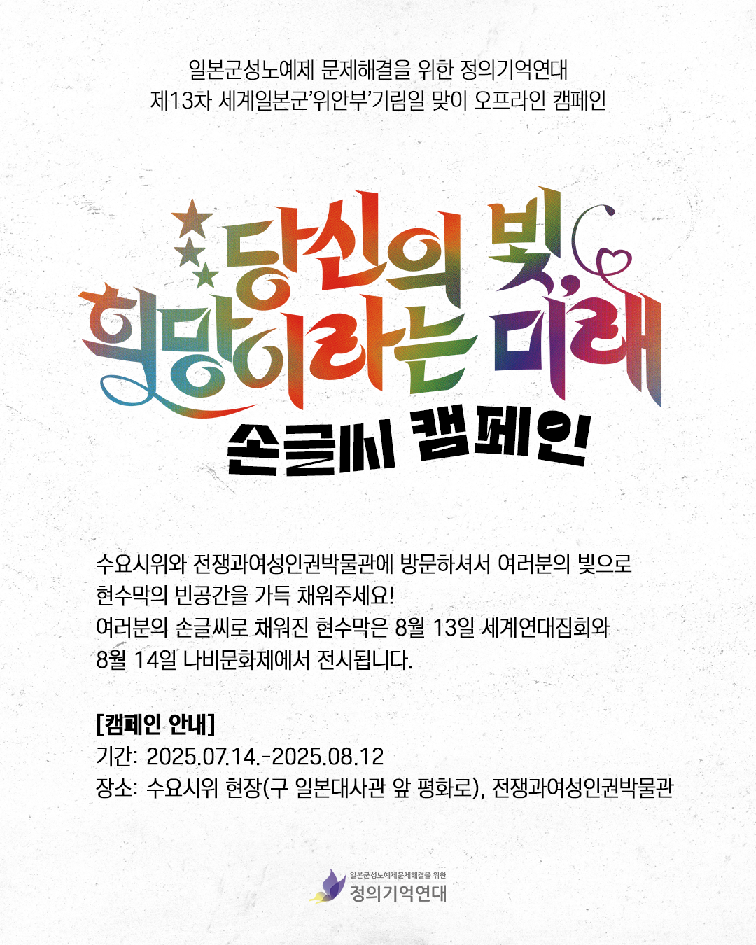 第13回世界日本軍「慰安婦」メモリアル・デーを迎え、正義記憶連帯では、国内外の市民の皆さんが共に参加できるオフラインキャンペーンを実施します。皆さん一人ひとりが持つ光を集めて、女性の人権と平和へとつながる道を明るく照らしてください!