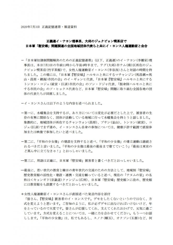 正義連イ・ナヨン理事長、大邱のジュクピョン喫茶店で 日本軍「慰安婦」問題関連の全国地域団体代表らと共にイ・ヨンス人権運動家と会合