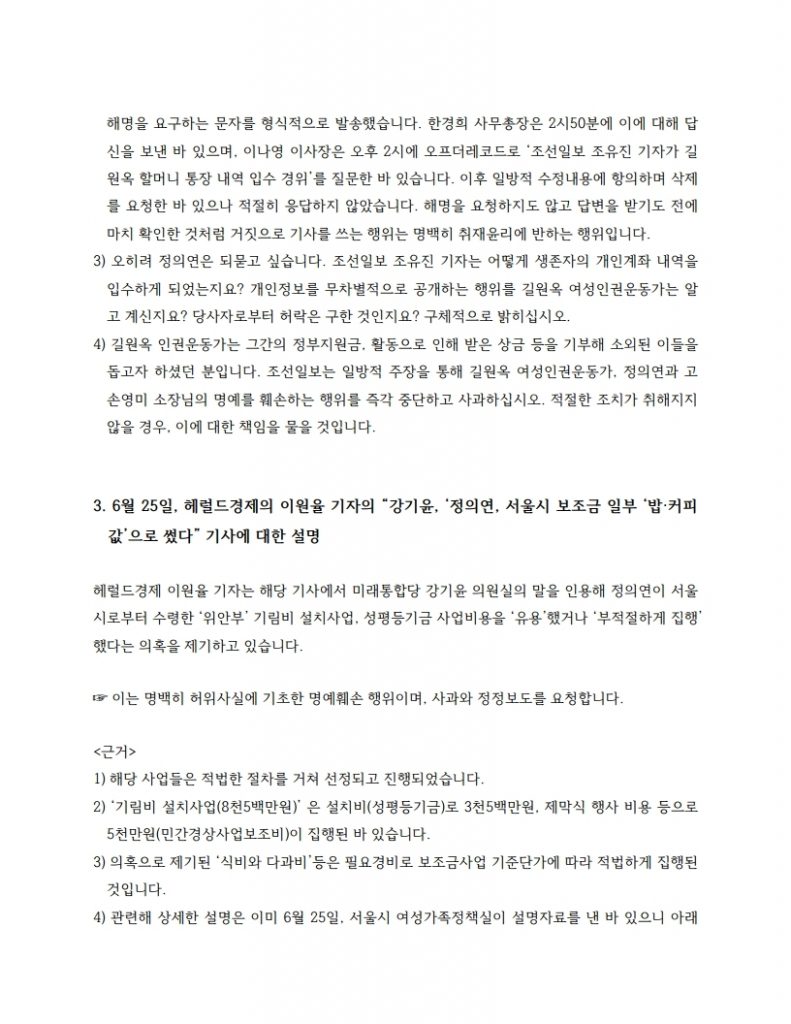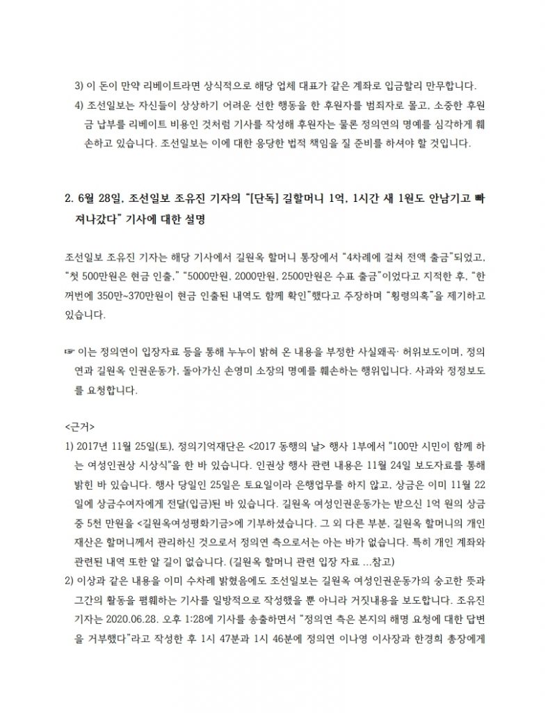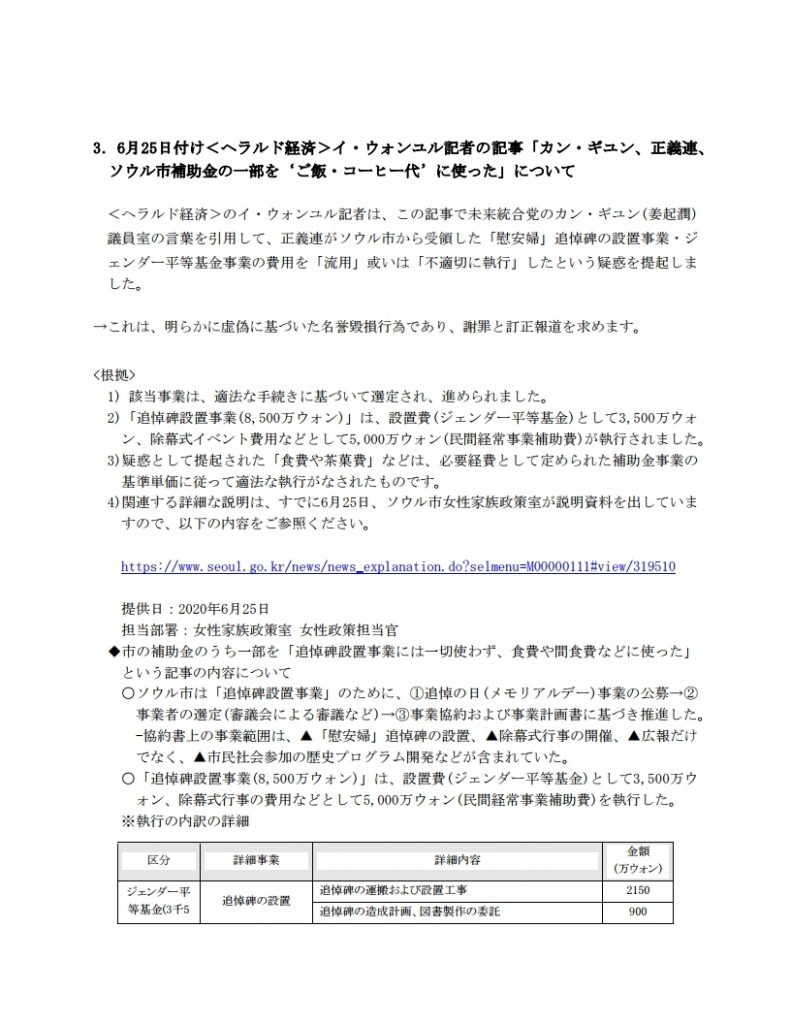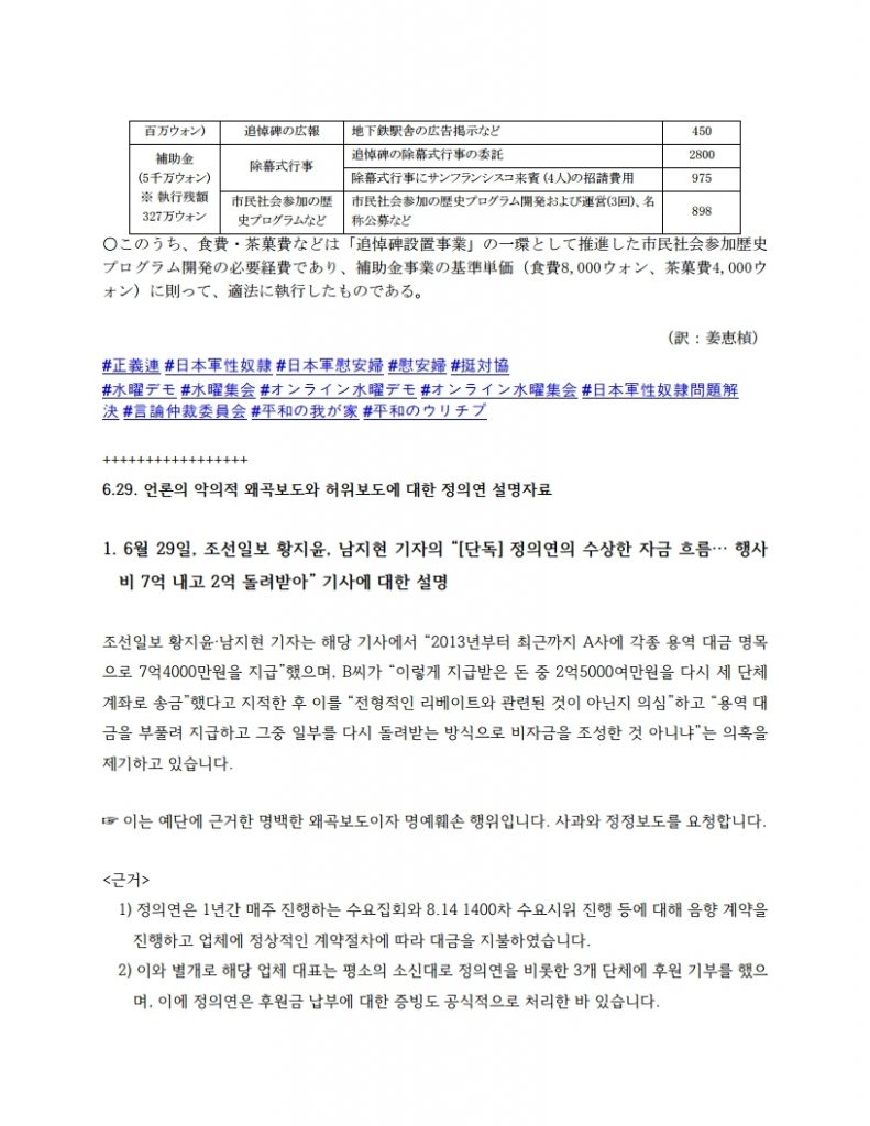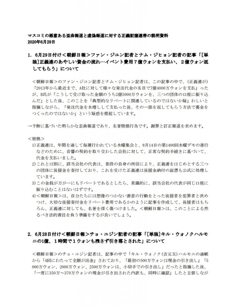 マスコミの悪意ある歪曲報道と虚偽報道に対する正義記憶連帯の説明資料